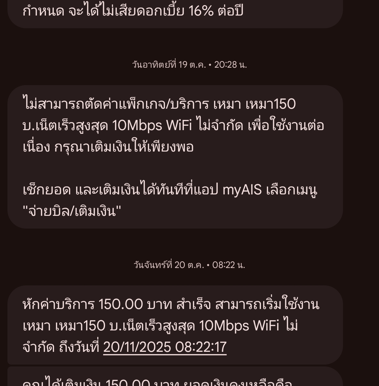 เดิมใช้เน็ตแพ็ก 200บาท. เน็ตไม่จำกัด เร็ว 10Mbps โทรฟรี 30วัน แล้วพอเติมเงินเข้าซิมประมาณ 250 บาท แล้วมีข้อความจาก AIS แจ้งมาว่า "เติมเงินรับสิทธิ์250บ.(รวม VAT) เน็ต 10Mbps 100GB (จากนั้นเร็ว 1M