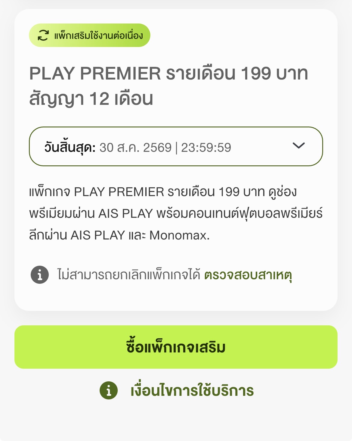 ขอวิธียกเลิกสมัครแพ็คเกจ AIS PLAY ดูพรีเมียร์ลีก 199 บาทหน่อยค่ะ