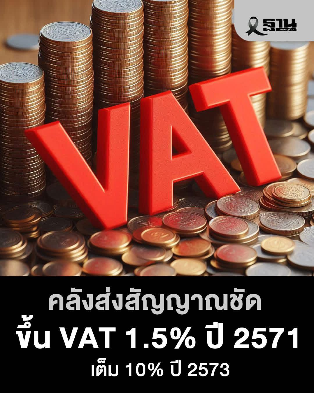 รัฐบาลเตรียมขยับ VAT จาก 7% เป็น 8.5% ในปี 2571 และจะเพิ่มเป็น 10% ในปี 2573 พร้อมจัดมาตรการบรรเทาผลกระทบทั้งต่อประชาชนและภาคธุรกิจ เพื่อให้การปรับอัตราภาษีเป็นไปแบบค่อยเป็นค่อยไปและไม่สะดุดต่อกิจกรรมเศรษฐกิจ