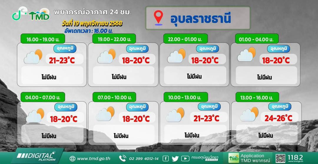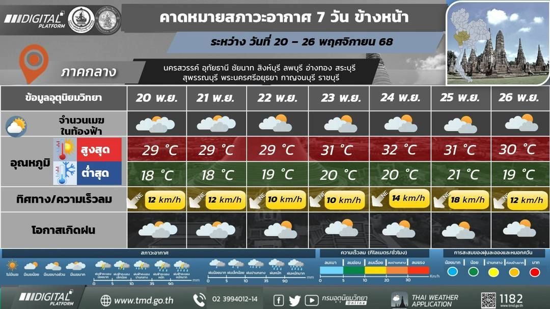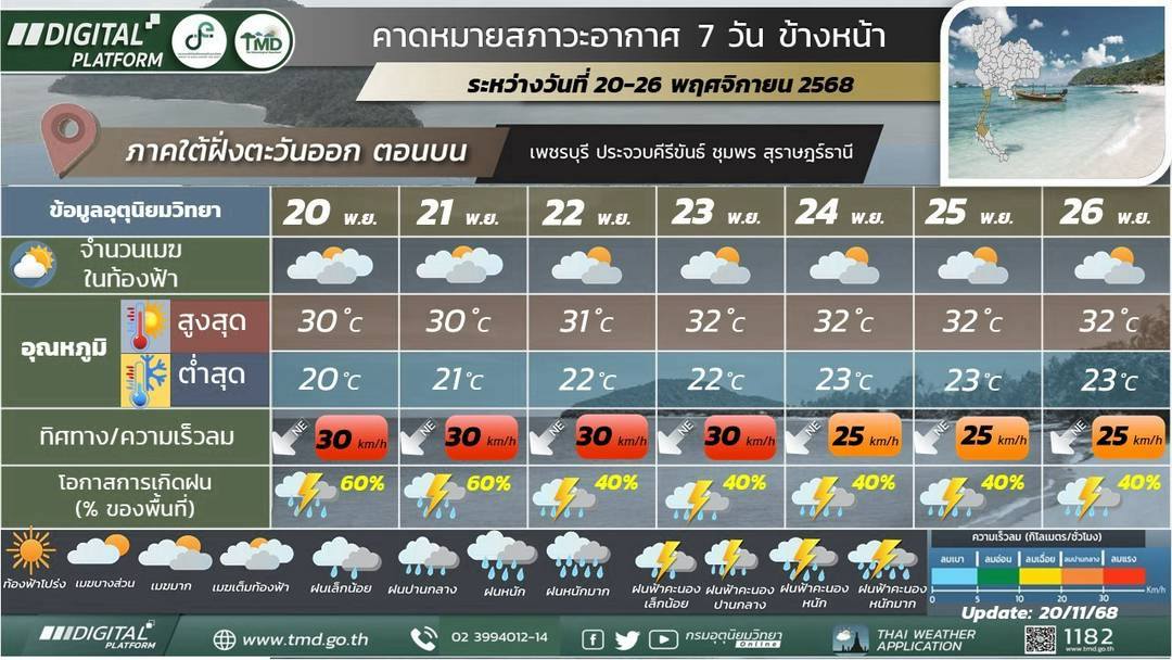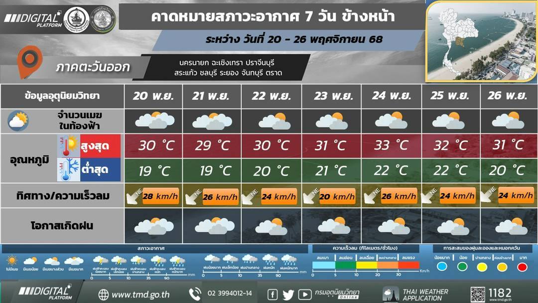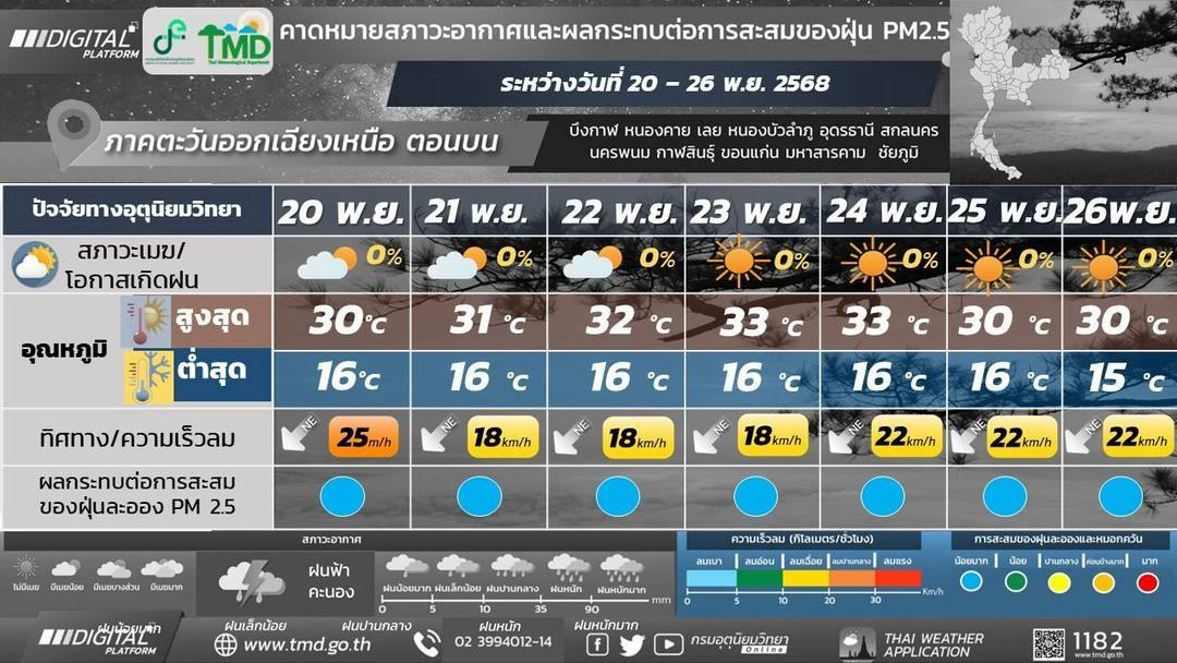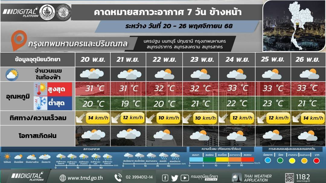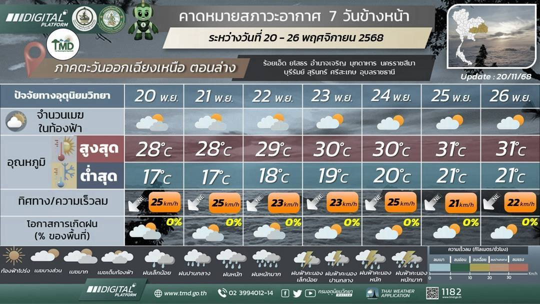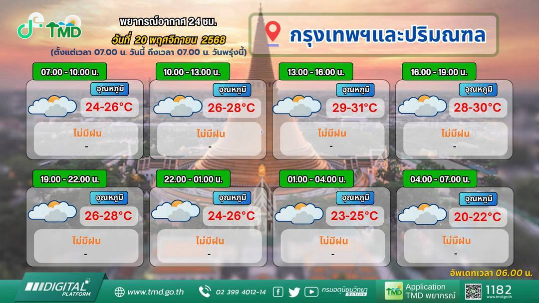 "กรมอุตุนิยมวิทยา" ประกาศฉบับที่ 11 เตือนไทยตอนบน "อากาศหนาวเย็น" อุณหภูมิจะลดลง 1-2 องศาฯ ส่วนภาคกลาง ตะวันออก กทม. ปริมณฑล มีอากาศเย็น-ลมแรง วันที่ 20 พ.ย. 2568&nb
