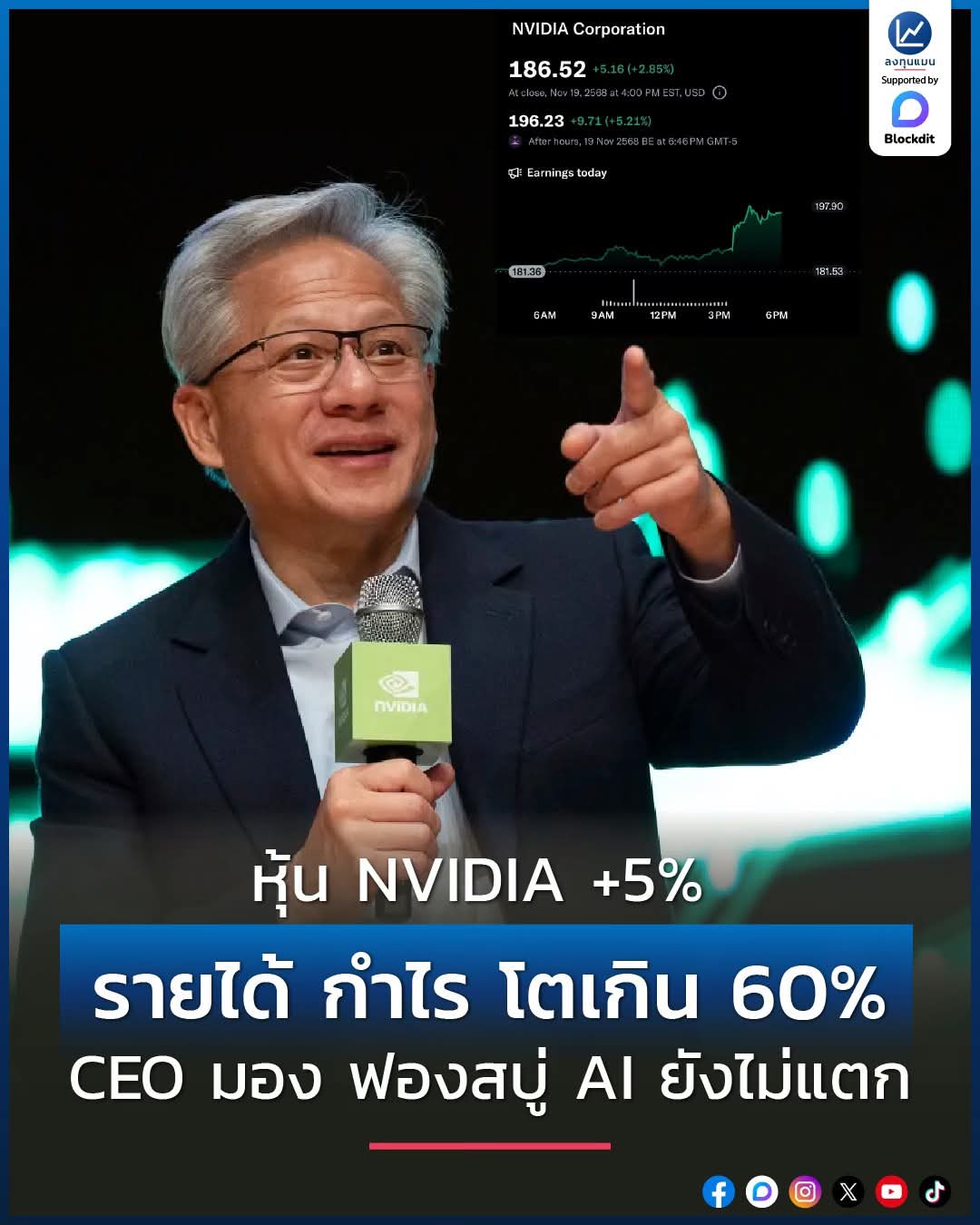 หุ้น NVIDIA +5% รายได้ กำไร โตเกิน 60% CEO มอง ฟองสบู่ AI ยังไม่แตก /โดย ลงทุนแมน
