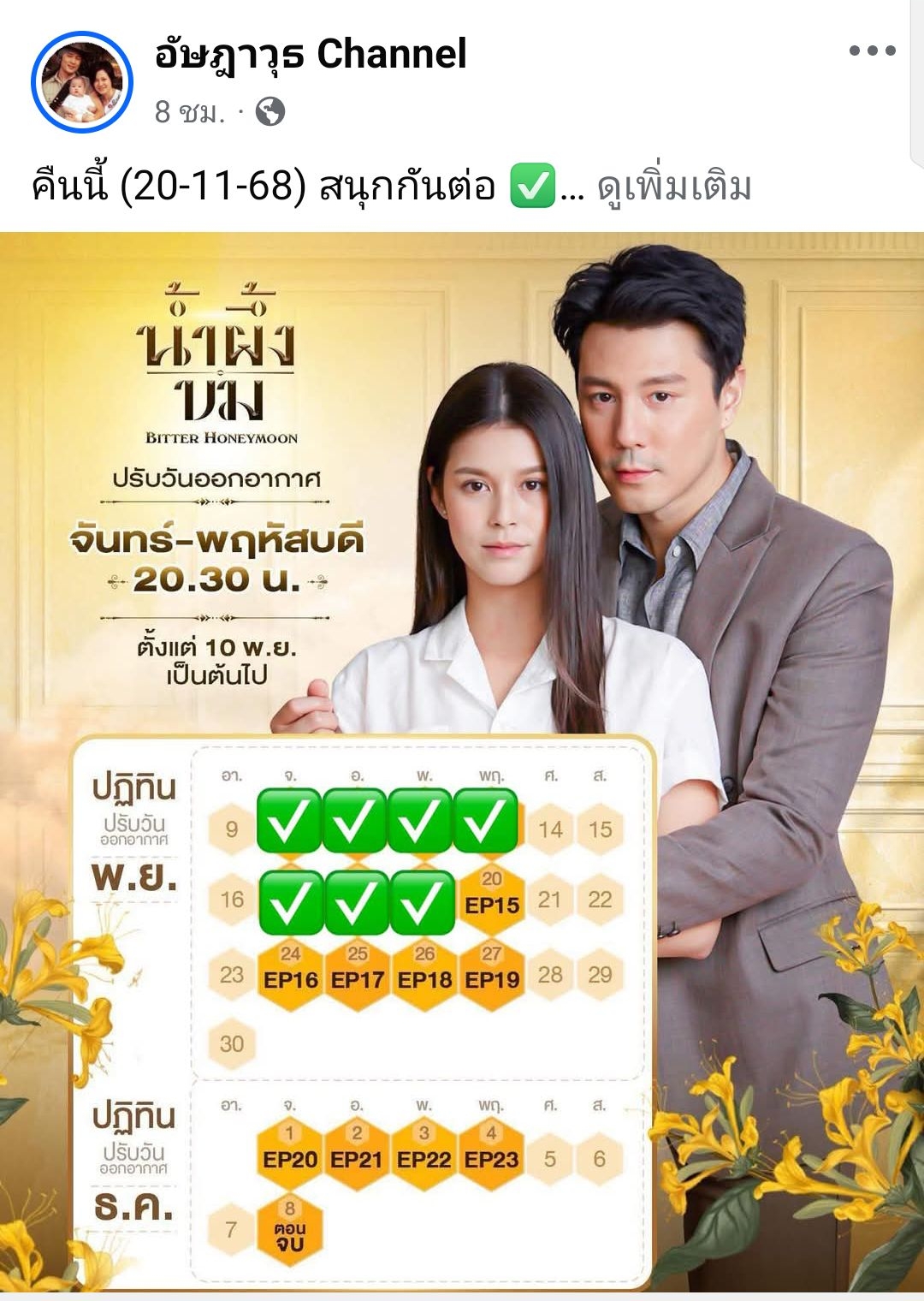 ละครน้ำผึ้งขม ปรับวันออกอากาศเป็นวันจันทร์-วันพฤหัสบดี เวลาเดิม 20.30 น. เริ่มวันที่ 10 พ.ย. เป็นต้นไป จะทีมนุ้ยหรือทีมคุณปุ๊ก็ห้ามพลาด 🍯🤍 #น้ำผึ้งขม #ABitterHoneymoon วันจันทร์-พฤหัสบดี เวลา 20.30 น