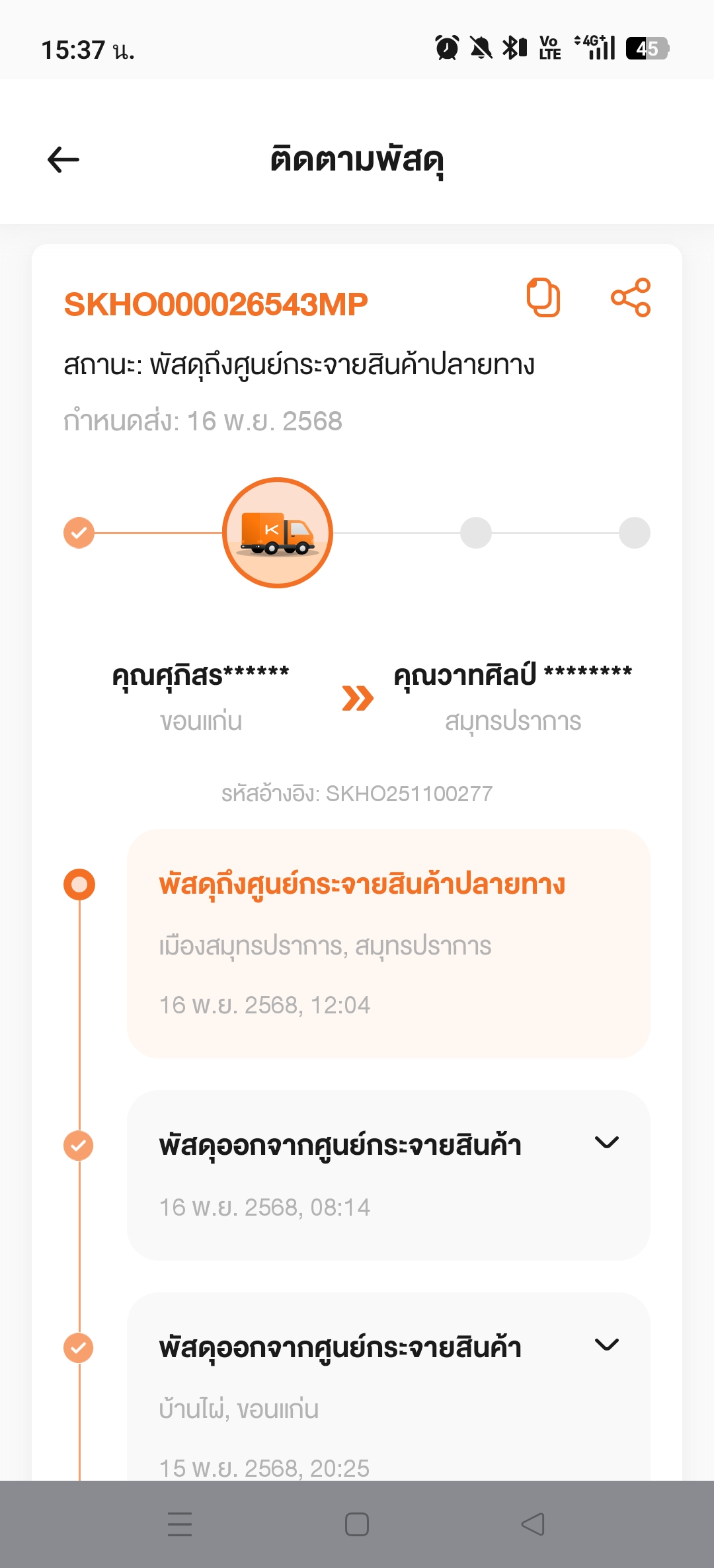 ได้ส่งพัสดุตั้งแต่วันที่15พ.ย. ของถึงสาขาปลายทางวันที่16พ.ย. แต่ก็ไม่มีการจัดส่งพัสดุให้ผู้รับ