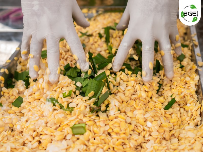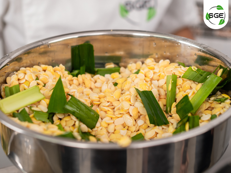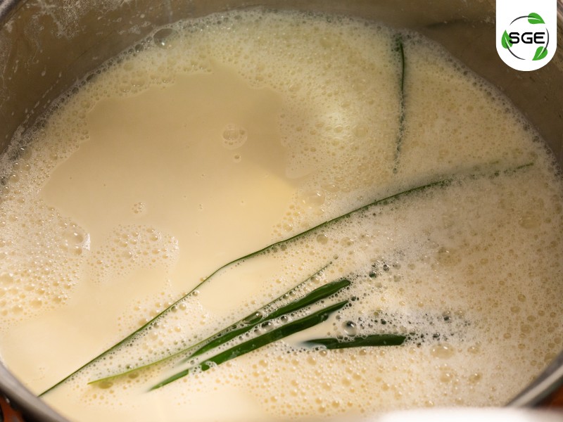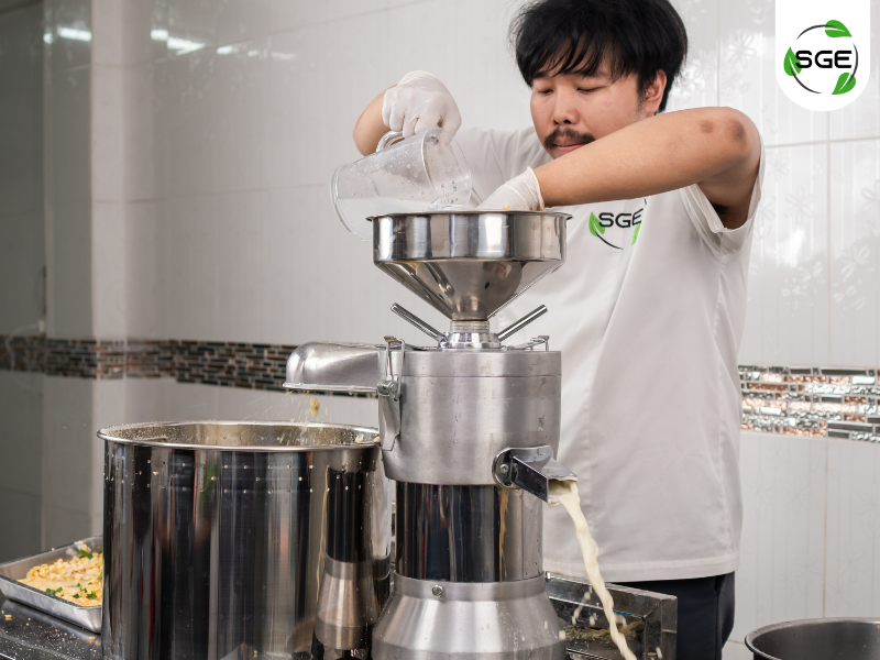 นำถั่วเหลืองและใบเตยตัด ที่เตรียมไว้ใส่ใน เครื่องทำน้ำเต้าหู้แยกกากของ SGE เปิดเครื่อง ค่อย ๆ เติมน้ำสะอาดตามอัตราส่วนที่กำหนด น้ำเต้าหู้ที่ปั่นจะไหลออกมาโดยแยกส่วนกับกาก ได้เนื้อน้ำเต้าหู้ที่เนียนละเอียดพร้อมต้มแล้ววว