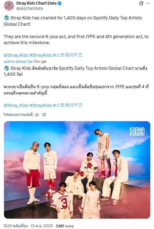 🔥Stray Kids Top 2 K-Pop ความนิยมระดับโลกที่ติดชาร์ตยาวนานที่สุดบน Spotify Daily Top Artists Global Chart ถึง 1,400 วัน