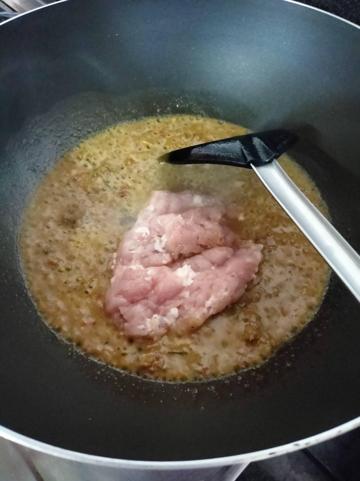 2.ใส่หมูสับลงไปผัดจนสุก ถ้าไม่เค็มปรุงรสด้วยน้ำปลา หรือน้ำปลาร้า ถ้าชอบเปรี้ยวเติมเปรี้ยวด้วยน้ำมะขามเปียกเล็กน้อย ผัดให้เข้าเนื้อ ชิมรสตามชอบ เน้นเค็ม ๆ เผ็ด ๆ นัว ๆ