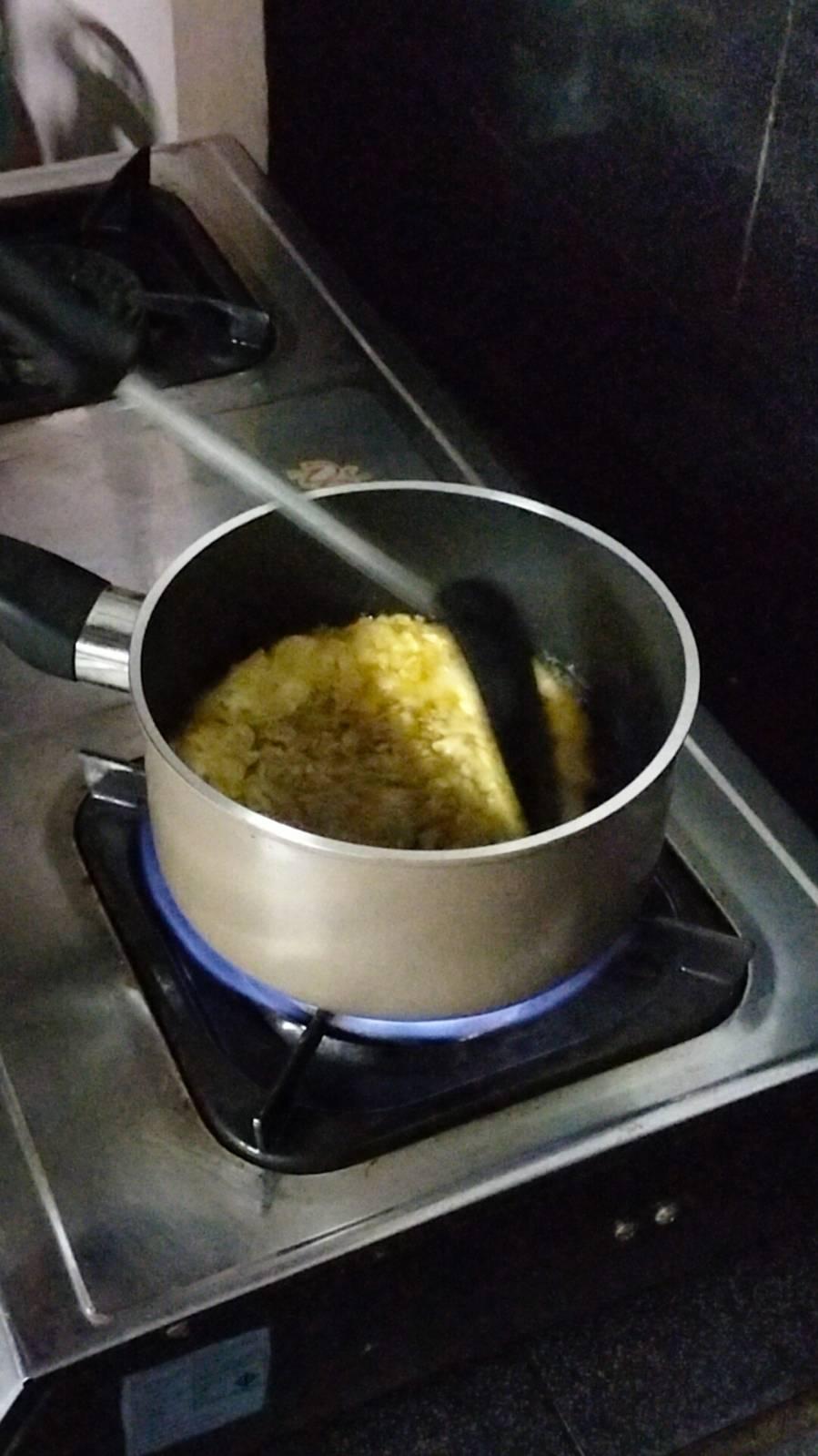 1.ตั้งกระทะ ใส่น้ำเปล่า ใส่น้ำพริกปลาร้าผัด ลงไปผัดให้เข้ากัน และมีกลิ่นหอม (ใช้น้ำเปล่าช่วยให้น้ำพริกละลาย เพราะในน้ำพริกมีน้ำมันอยู่แล้ว