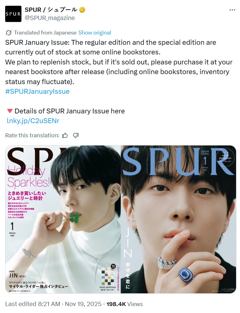 ตามรายงานของ SPUR นิตยสาร SPUR ฉบับเดือนมกราคม ที่เป็นฉบับพิเศษร่วมกับจิน (Jin x SPUR January Issue) นั้น ทั้งฉบับปกติและฉบับพิเศษ สินค้าหมด ในร้านหนังสือออนไลน์บางแห่งในขณะนี้
