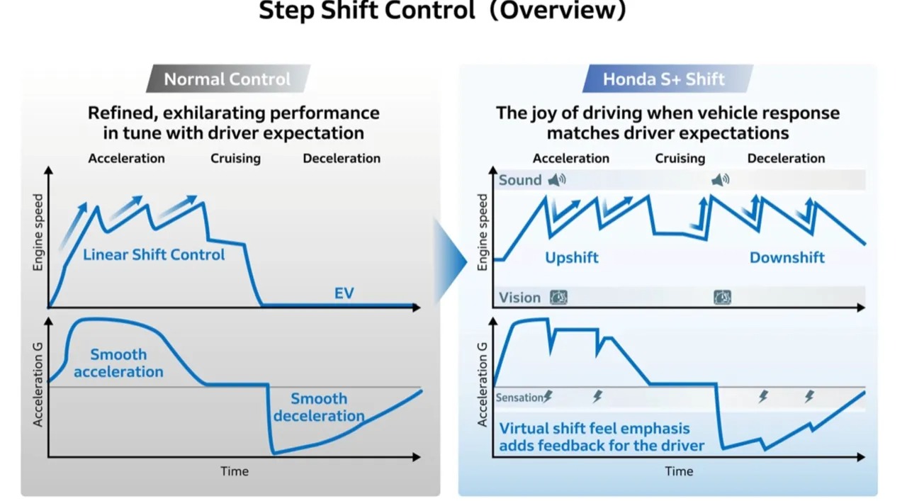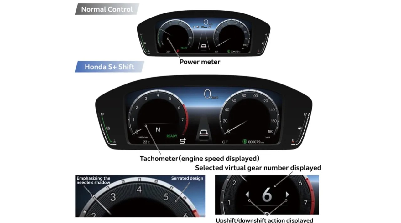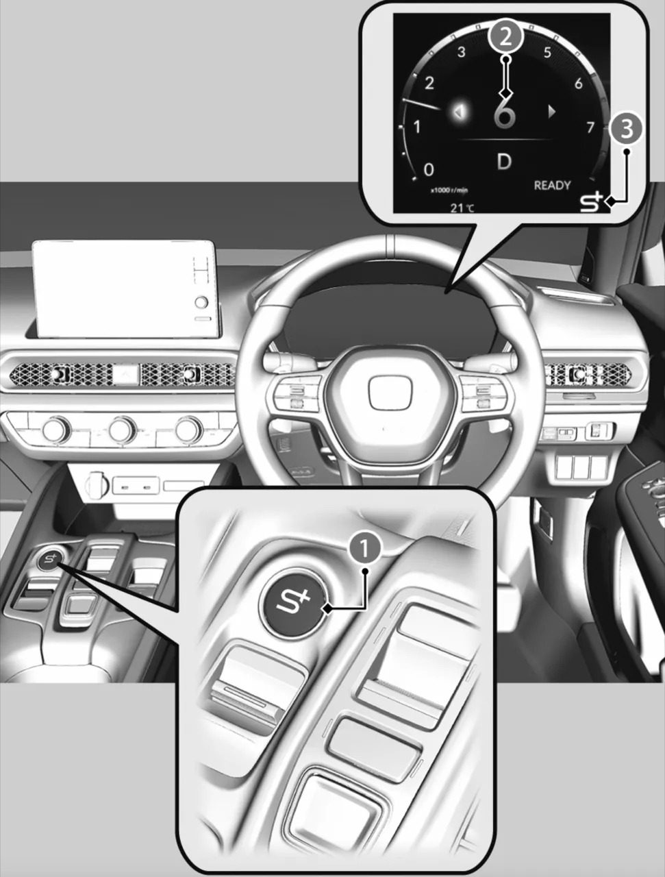 S+ Shift เป็นเทคโนโลยีซอฟต์แวร์ของ Honda ที่จำลองความรู้สึกของการเปลี่ยนเกียร์แบบรถยนต์ที่ขับเคลื่อนด้วยเครื่องยนต์สันดาปภายใน เพื่อมอบประสบการณ์การขับขี่ที่น่าตื่นเต้นในการควบคุมรถยนต์ไฮบริด ระบบนี้ไม่ได้เปลี่ยนเกียร์จริง แต่จะปรับการตอบสนองของมอเตอร์ไฟฟ้าและเพิ่มความไวของแป้นคันเร่ง เพื่อเลียนแบบการเปลี่ยนเกียร์