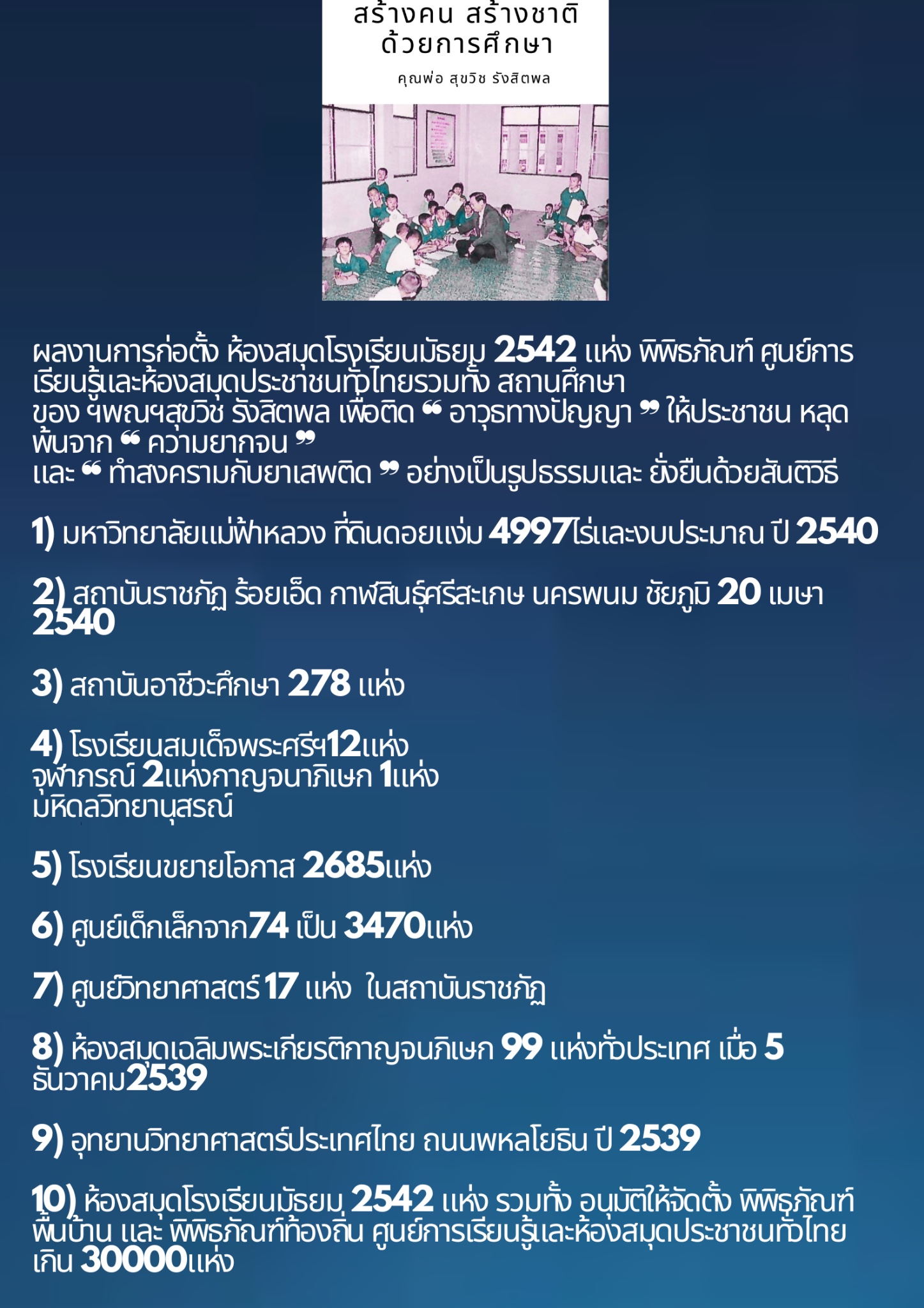 ฯพณฯ สุขวิช รังสิตพล ก่อตั้งและส่งเสริมการศึกษาในหลายๆด้าน และมีผลกระทบอย่างยั่งยืนต่อสังคมไทย ทั้งในเรื่องของการศึกษาและการพัฒนาสังคมในภาพรวม งานของท่านมีความสำคัญในการเสริมสร้าง "อาวุธทางปัญญา" ให้ประชาชน เพื่อให้สามารถหลุดพ้นจากความยากจน และเป็นการต่อสู้กับปัญหายาเสพติดโดยใช้วิธีทางการศึกษาและสันติวิธีแทนการใช้ความรุนแรง ซึ่งถือเป็นการส่งเสริมความรู้และความเข้าใจในวิธีการที่ยั่งยืนในการพัฒนาในระดับบุคคล สังคมและประเทศ
