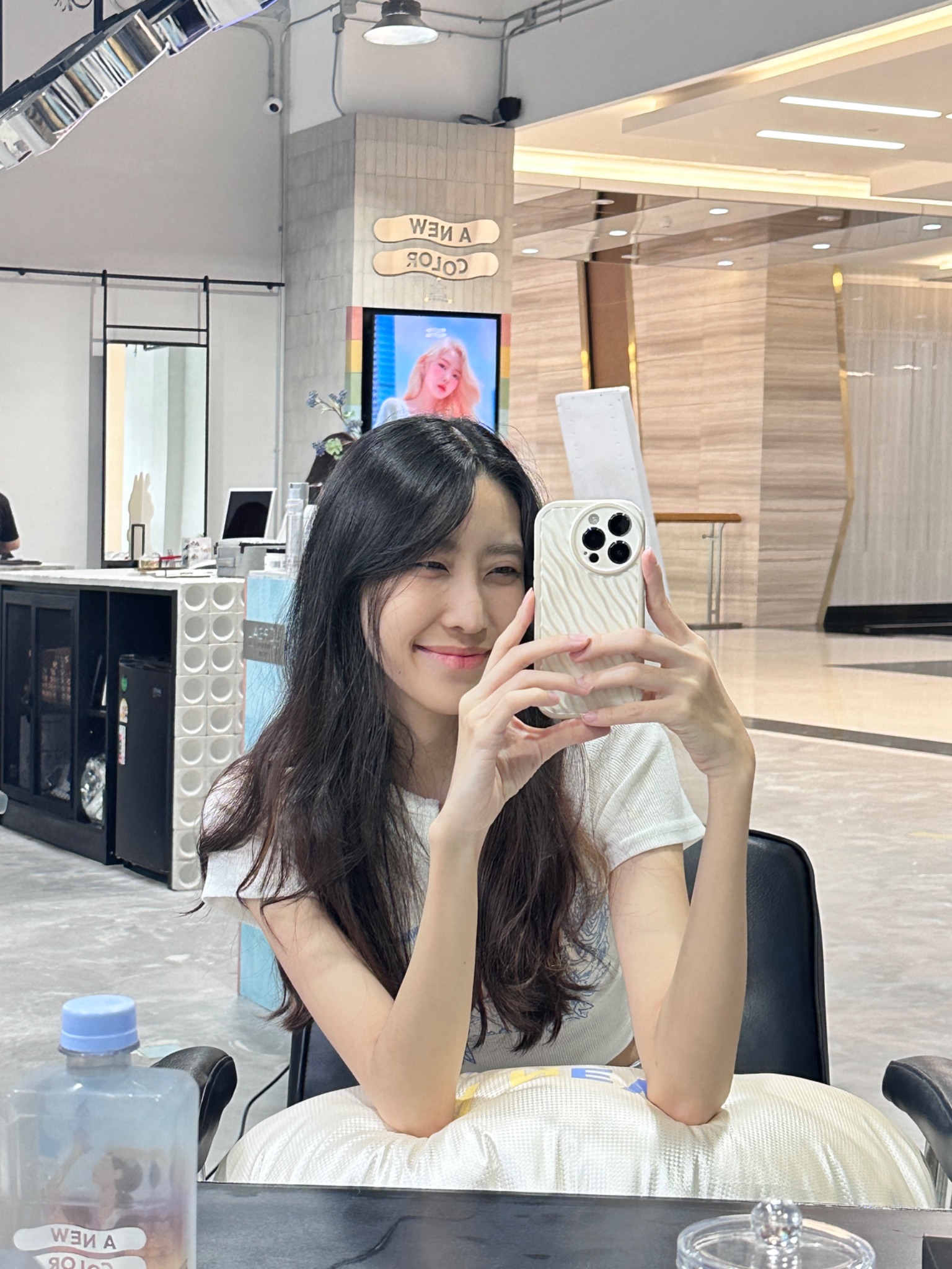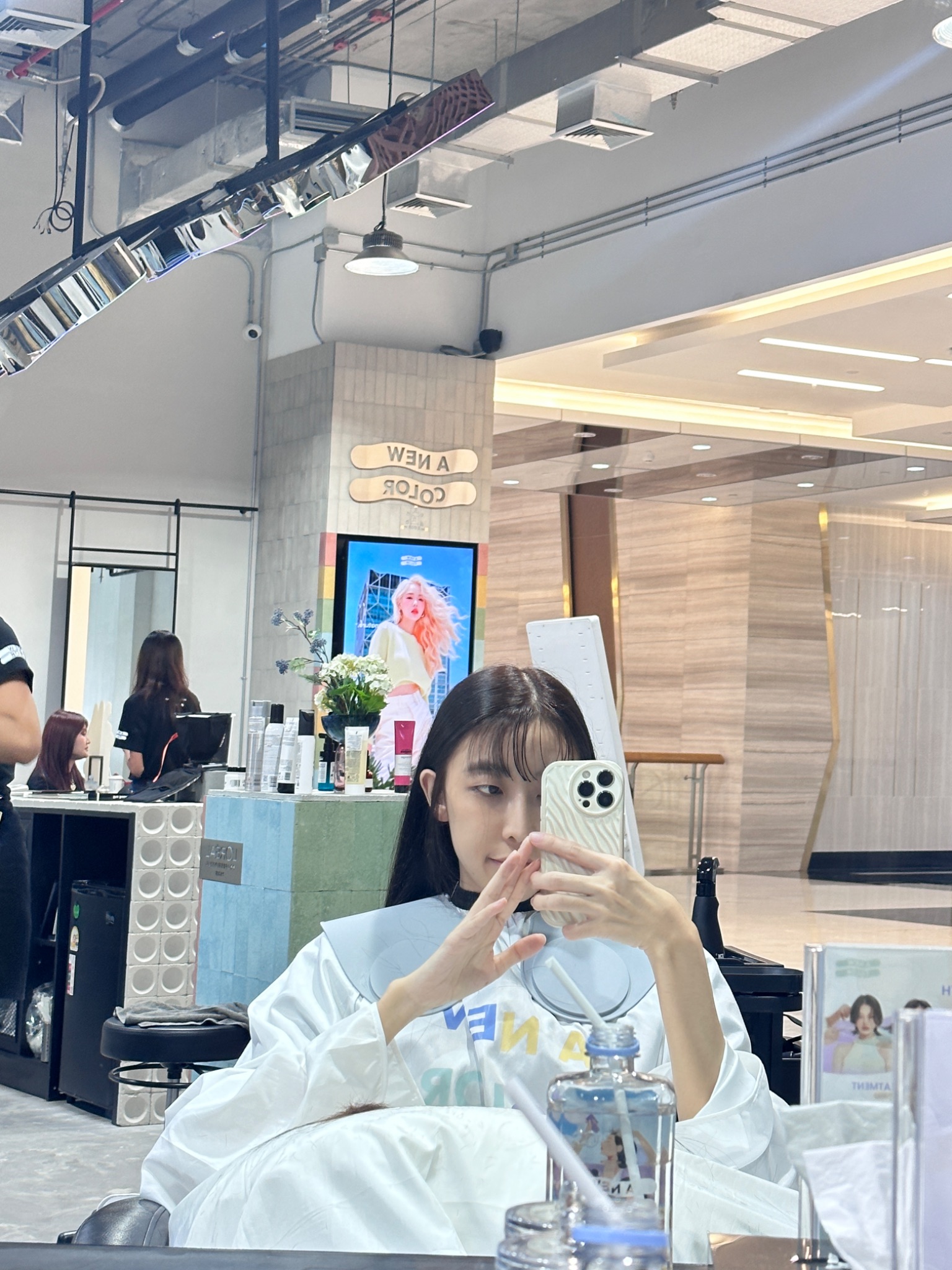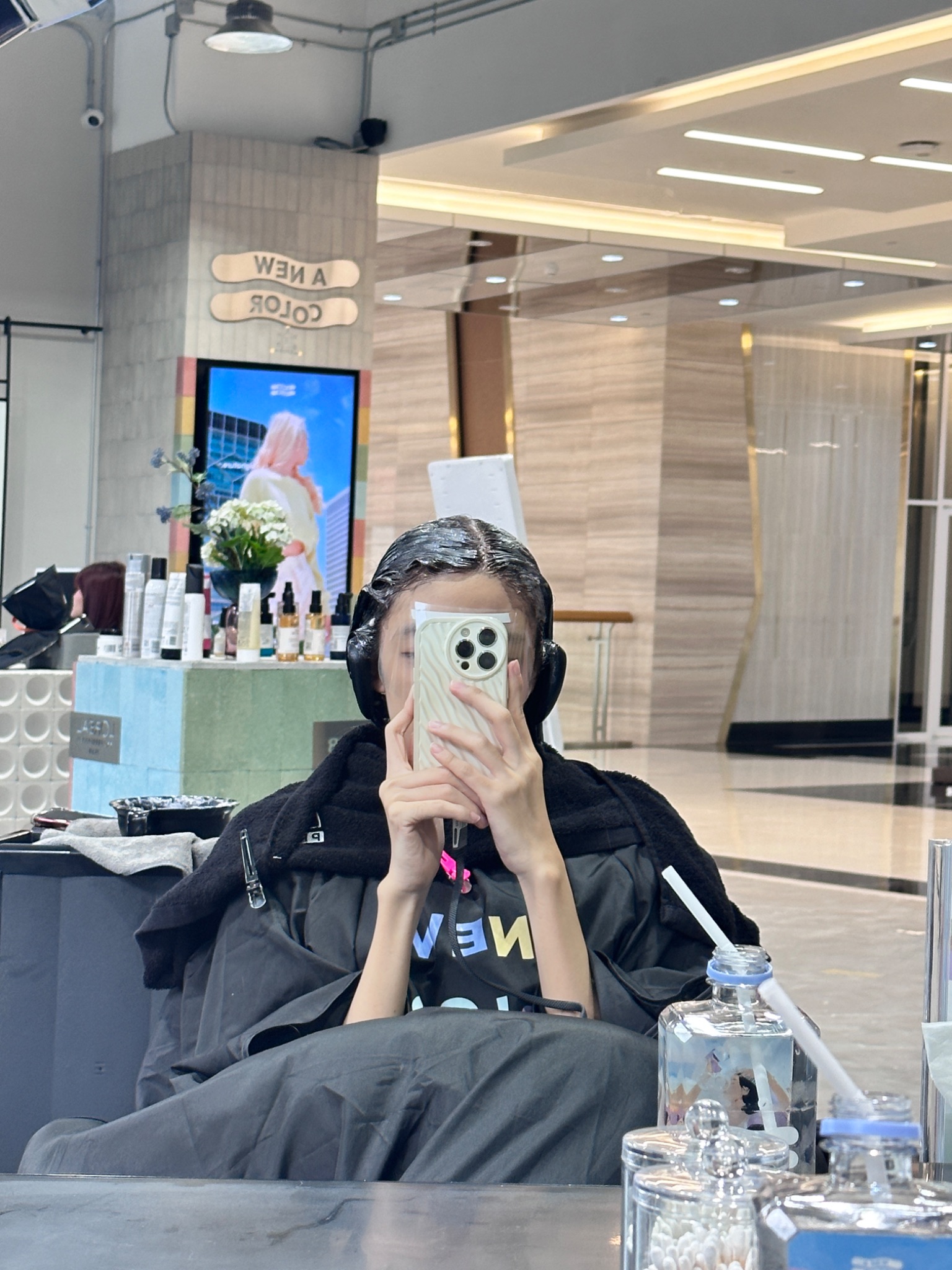 ระหว่างรอก็สบาย ๆ ร้านเค้าเก้าอี้นั่งสบาย มีหมอนหนุนแขน น้ำก็เป็นแบบเหมาะกับบำรุงเส้นผม บรรยากาศร้านสบายตาอยู่แล้วนะ นั่งรอเพลินเลยค่ะ