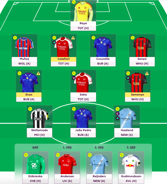 วีคก่อน roll FT ไว้สำหรับรับมือโปรแกรมเทิร์น GW12 แต่ก็ต้องมีข่าวเช็คฟิตที่ต้องตามทั้ง คาลาฟิออรี, เอ็นโซ, เซเมนโย ซึ่งทั้งหมดน่าจะพอถือต่อไปได้ ไว้ไปพิจารณาปรับตรงอื่นดีกว่า ถ้าอยากมีตัวนำ template เข้ามา อย่างที่ว่าไป