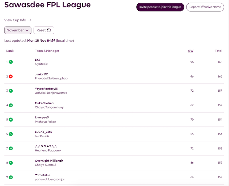 ตารางคะแนน Sawasdee FPL League เดือน พ.ย. หลังจบ GW11