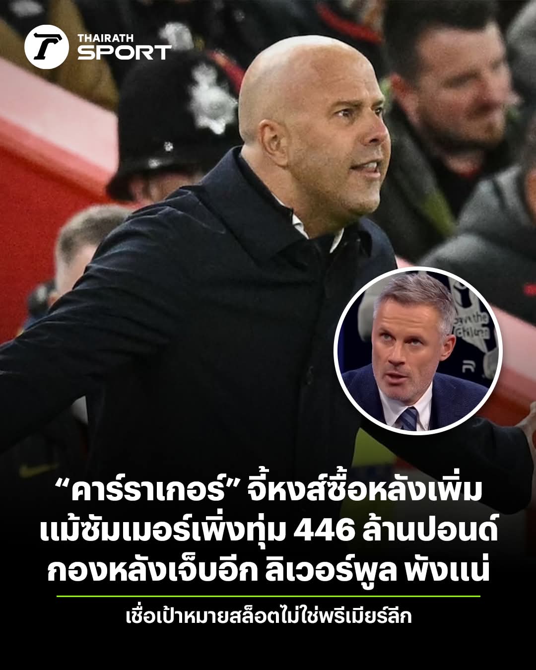 เจมี่ คาร์ราเกอร์ ตำนานแข้ง “หงส์แดง” เชื่อว่าลิเวอร์พูลจำเป็นต้องหานักเตะเสริมในตลาดซื้อขายเดือนมกราคม เพื่อช่วยกู้สถานการณ์ทีม แม้ว่าพวกเขาจะทุ่มเงินไปแล้ว 446 ล้านปอนด์ ในการคว้านักเตะอย่าง อเล็กซานเดอร์ อิซัค, อูโก้ เอกิติเก้, ฟลอเรียน เวียร์ตซ์, เจเรมี ฟริมปง, มิลอส เคอร์เกซ และ จิโอวานี เลโอนี ในช่วงตลาดซื้อขายที่ผ่านมา