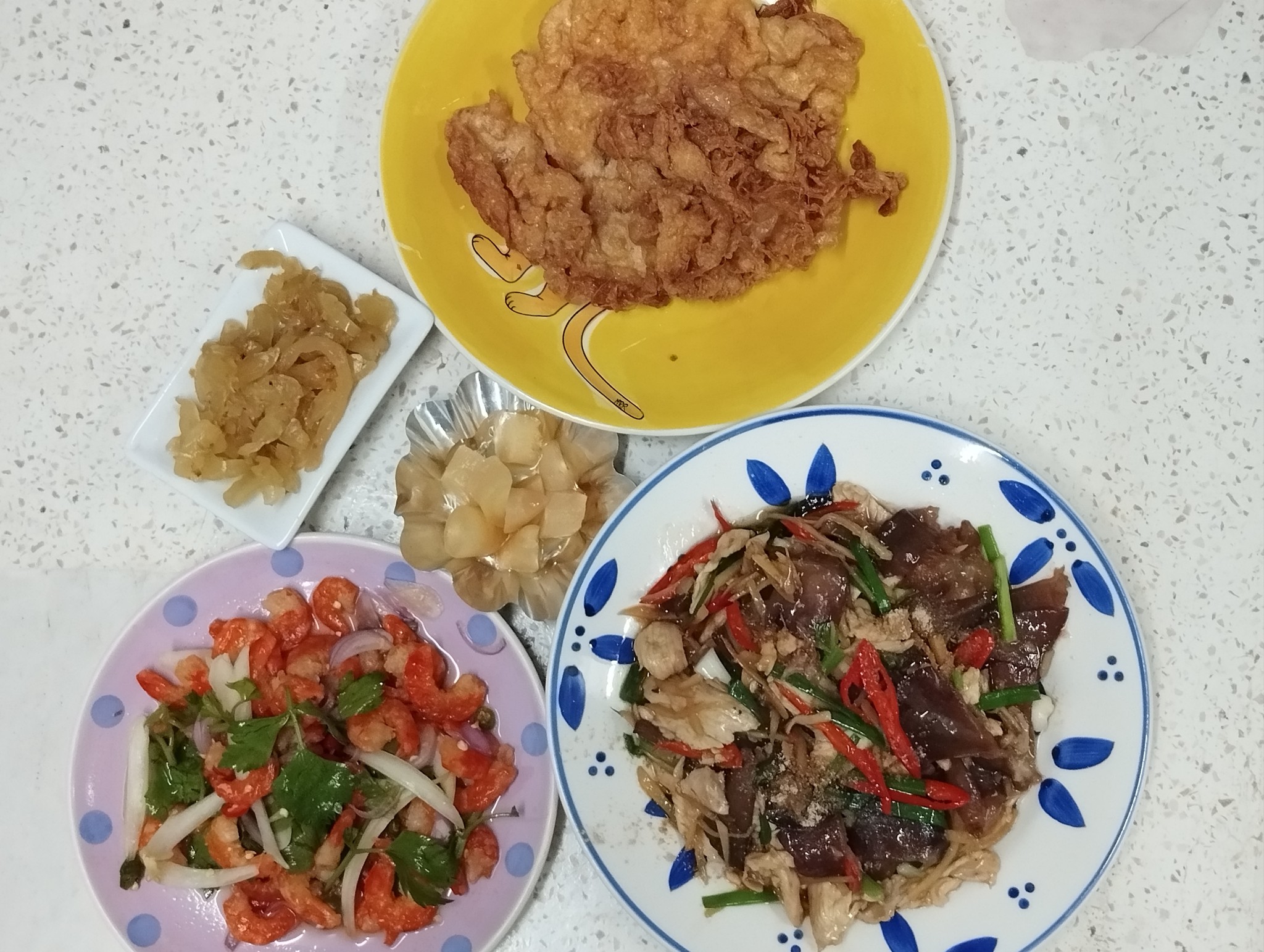 ท่าน ผบ. อยากกินไก่ผัดขิง กับ ยำกุ้งแห้ง ส่วนผมตอนไปจ่ายตลาดเช้าแวะซื้อ ก๊งฉ่าย กับ ขิงดองเต้าเจี้ยว ติดมือกลับมาด้วย เสริมทัพด้วยไข่เจียวหนึ่งฟอง รวมร่างเป็นมื้อเย็นวันนี้ครีบ