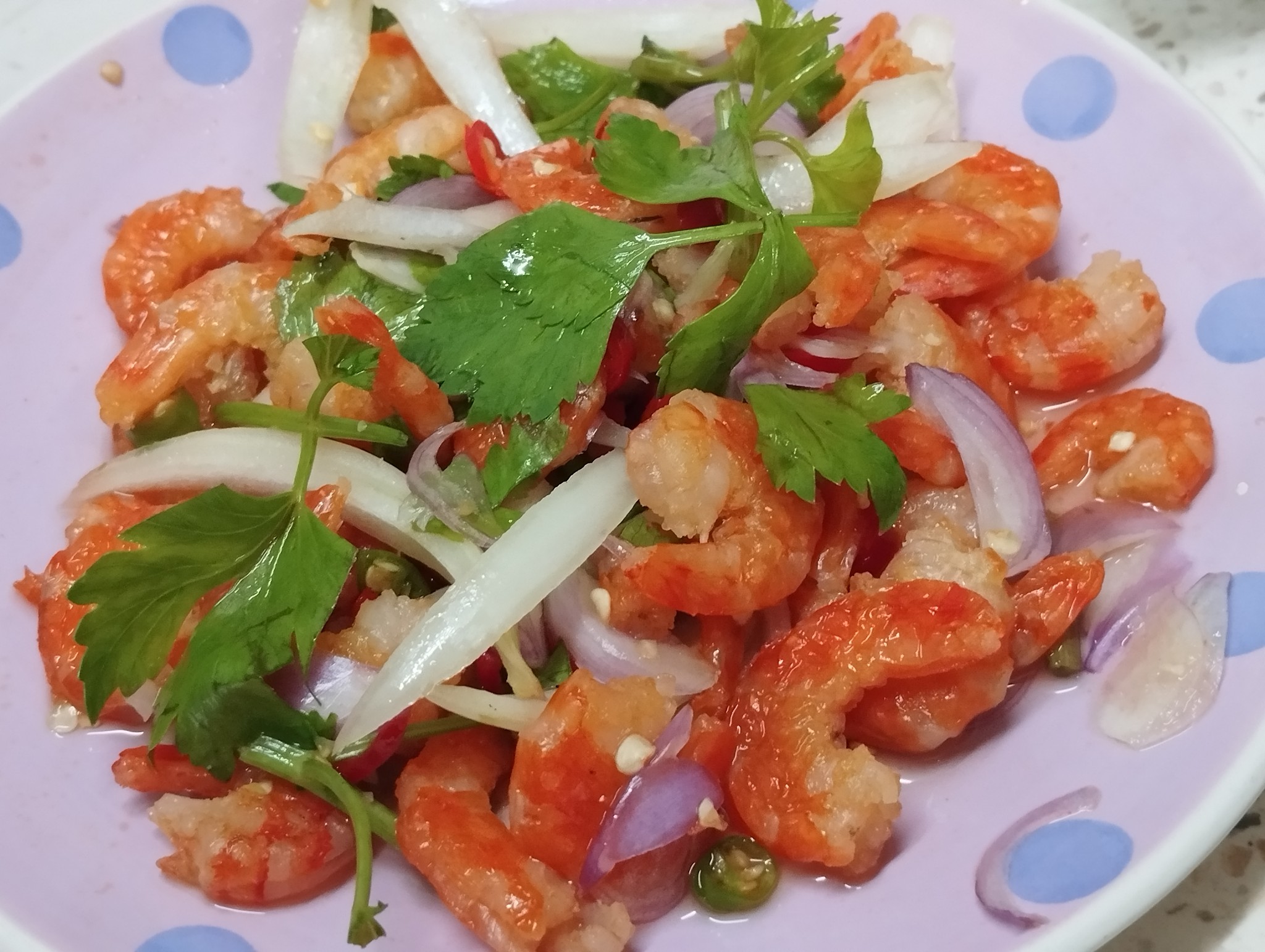 ยำกุ้งแห้ง ใช้กุ้งแห้งเนื้อไซส์ใหญ่หน่อย แช่น้ำก่อนซักสิบห้านาที แล้วค่อยเอามาคั่วให้แห้งหน่อยก่อนจะยำ จานแค่นี้ค่ากุ้งร่วมห้าสิบบาท ฉะนั้นไปกินตามร้านแล้วถ้าเขาคิดมาร้อยกว่าบาทก็ไม่น่าแปลกใจ