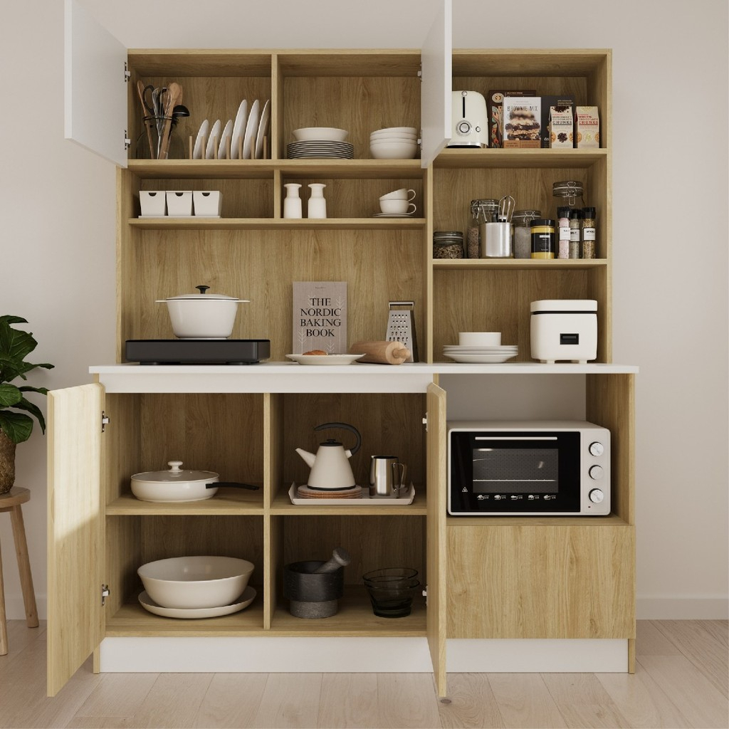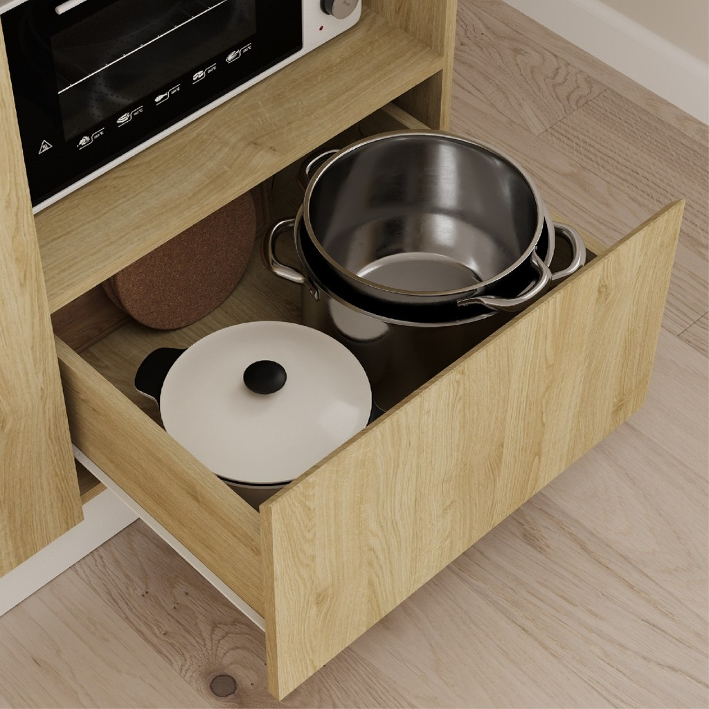 ตู้ครัวเมลามีนลายไม้จาก KUCHE รุ่น ตู้ครัว 150 ซม Kitchin บอนดี้โอ๊ค เหมาะกับคนที่อยากมีมุมเตรียมอาหารดูสะอาดตาและหยิบใช้งานง่ายในชุดเดียว ขนาด 150x60x180 ซม. แยกตู้บน–ตู้ล่าง มีช่องไมโครเวฟ ชั้นวางของ และท็อปสีขาวสำหรับเตรียมอาหาร ช่วยจัดเก็บจานชาม เครื่องปรุง และอุปกรณ์ไฟฟ้าให้เป็นระเบียบในพื้นที่จำกัดทั้งคอนโดและทาวน์โฮม 🍳