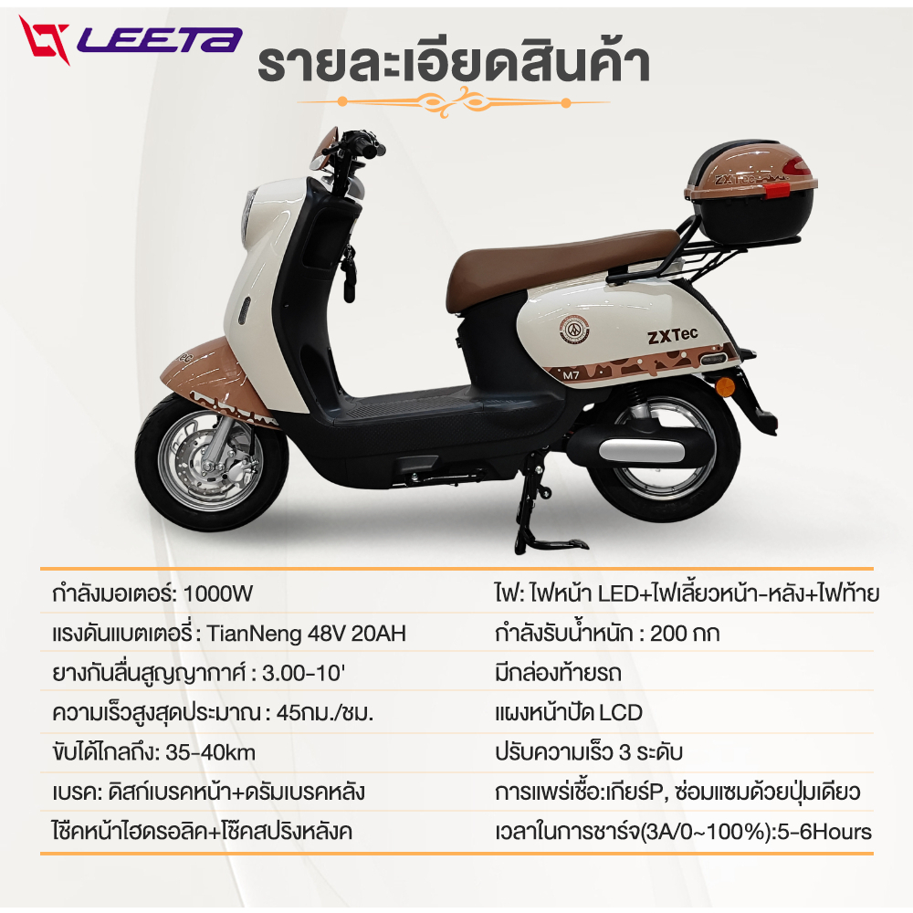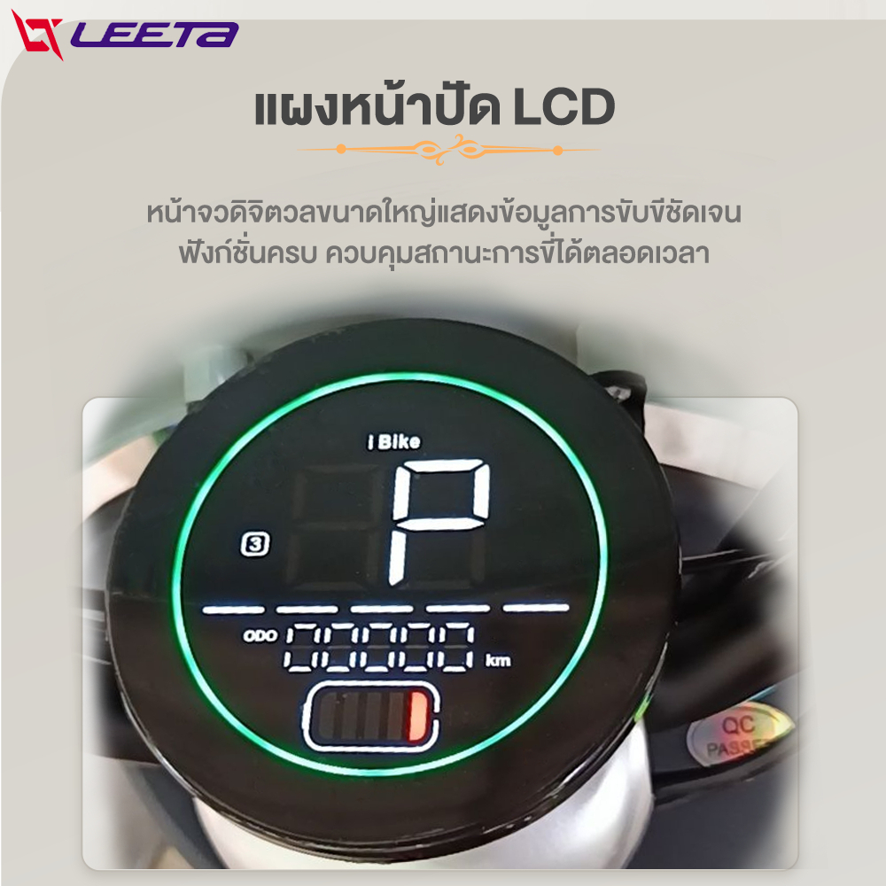 ใครมองหาพาหนะไปทำงานหรือเรียนในเมืองแบบไม่ต้องแวะปั๊มบ่อย มอเตอร์ไซค์ไฟฟ้า LEETA คันนี้ตอบโจทย์ด้วยมอเตอร์ 1000W แบตเตอรี่ TianNeng 48V 20AH วิ่งได้ประมาณ 35–40 กม. ต่อการชาร์จหนึ่งครั้ง ความเร็วสูงสุดราว 45 กม./ชม. แผงหน้าปัด LCD อ่านง่าย มีกล่องท้ายเก็บของ เหมาะกับทั้งขี่ในซอยและบนถนนหลักระยะใกล้ถึงกลาง 🛵