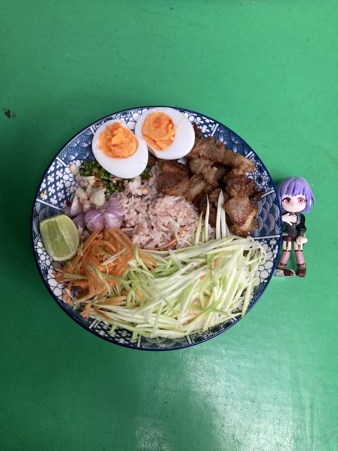มีหมูทอดน้ำปลาเหลือจากวันก่อนนู้น แช่แข็งไว้เอาออกมาจัดใส่จาน พริกขี้หนูเด็ดมาจากต้นหน้าบ้าน มะม่วงซื้อมา 1 ลูก
