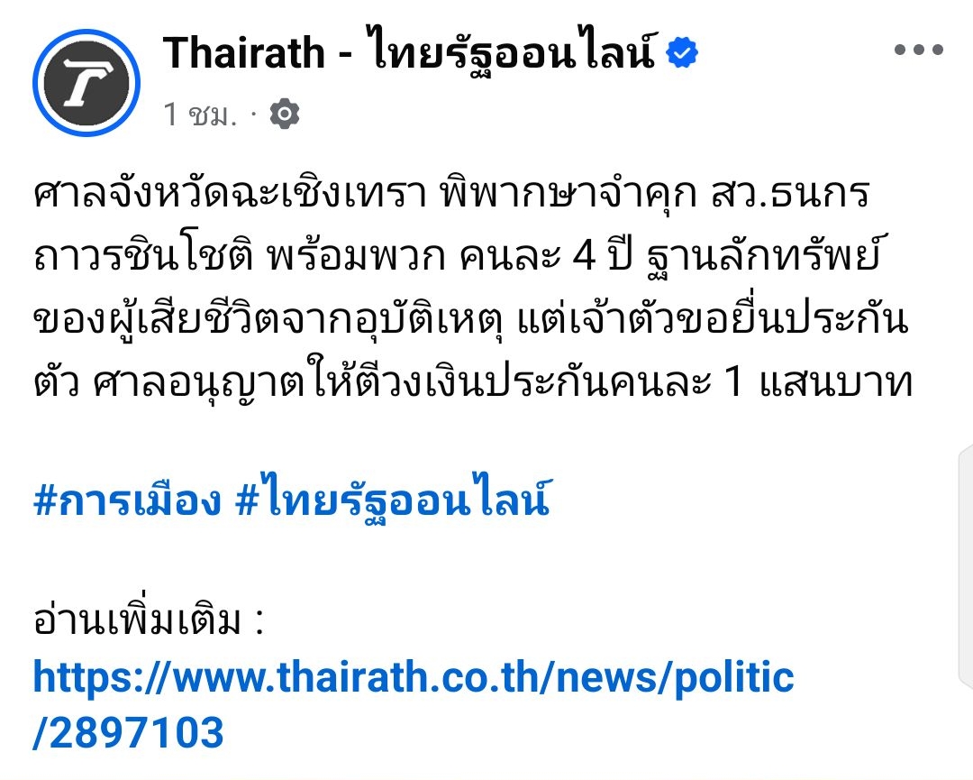 🧑⚖️ พิพากษาจำคุก สว.ธนกร ถาวรชินโชติ พร้อมพวก คนละ 4 ปี ฐานลักทรัพย์ของผู้เสียชีวิตจากอุบัติเหตุ