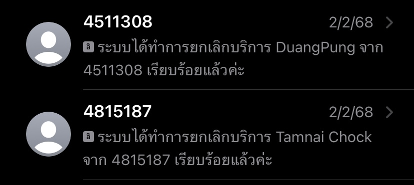 ทำไมมีข้อความแบบนี้เข้ามาตลอดเลยทั้งๆที่กดยกเลิกไปหลายรอบแล้วโดนหักเงินประจำเวลาเติมเงินปุ๊บห้กเงินปั๊บ ทั้งที่โทรหาทรูแล้วบอกยกเลิกให้แต่ก็ยังมีมาตลอดเลยจนไม่กล้าจะเติมเงินแล้ว (ขอบคุณที่สมัคร Dai