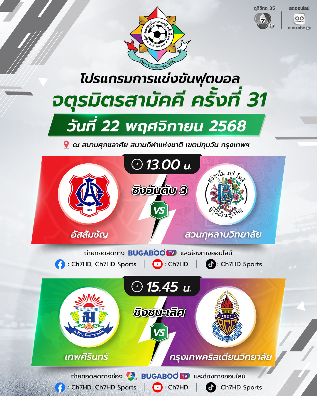 โปรแกรมการแข่งขัน ฟุตบอลจตุรมิตรสามัคคี ครั้งที่ 31 17 พ.ย. นี้