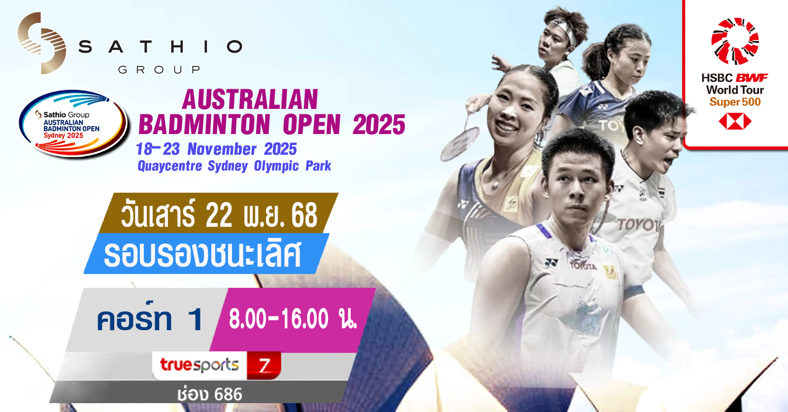 เชียร์สด ! แบดมินตัน SATHIO GROUP Australian Open 2025 : รอบรองชนะเลิศ (22 พ.ย. 68) (คู่แรก 8.00 น.)