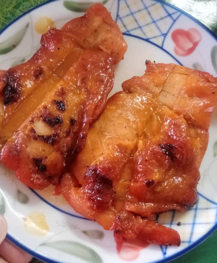 ซื้อมาเมื่อวาน แช่ไว้ เอามาอุ่นด้วยเตาทำแซนวิชเท่านั้นแหละ ไก่ก็เผยความชุ่มฉ่ำน่าทานออกมาเลย ดูตามภาพ