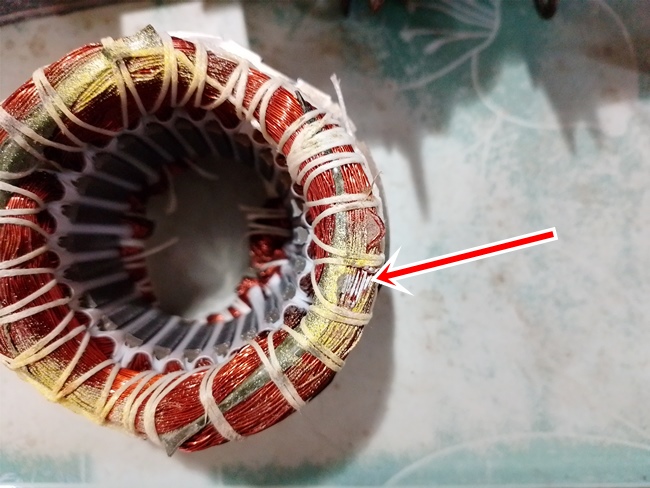 ผมขูดจุดที่ลูกศรชี้ ภายนอกที่ดูเหมือนทองแดงแต่ภายในเป็นอลูมิเนียมซึ่งไม่ทนทานเมื่อใช้งานจะร้อนจัดแล้วพังในระยะเวลาอันสั้น อลูมิเนี่ยมนั้นราคาแตกต่างกับทองแดงหลายเท่าของราคาถูกไม่ว่าจะเป็นมอเตอร์ หม้อแปลง ถ้าถูกกว่าปกติให้หลีกเลี่ยงอย่าซื้อ
