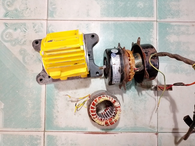 ผมเสียดายโครงมอเตอร์ที่ยังใหม่ดูดีคิดที่จะสลับโครงกับมอเตอร์พัดลมไอเย็นซึ่งผมนำมาใช้เป็นมอเตอร์หินเจียร ขนาดของมอเตอร์ใกล้เคียงกันพอใช้เวอร์เนียวัดขนาดสเตเตอร์แล้วขนาดไม่เท่ากัน ชิ้นส่วนปั๊มน้ำราคาถูกใช้ประโยชน์อะไรไม่ได้เลยขายเป็นของเก่าก็ไม่ได้ราคาเพราะมันไม่ใช่ทองแดง