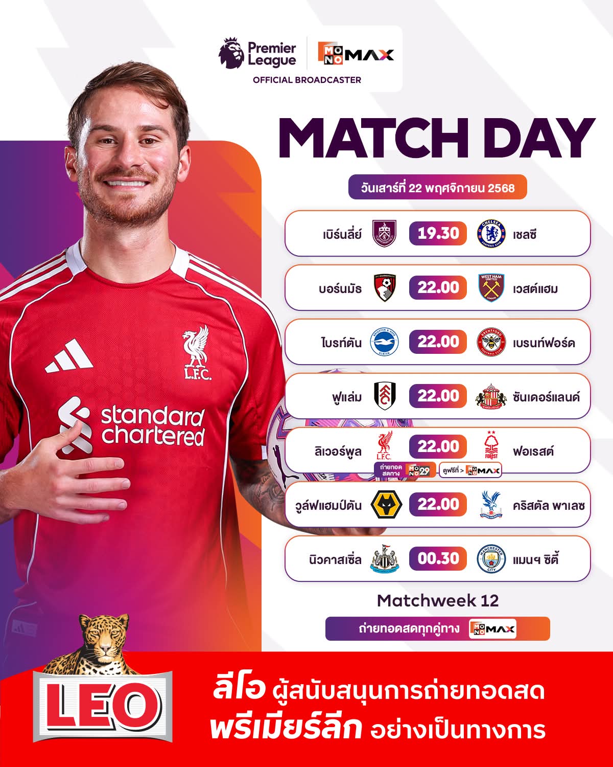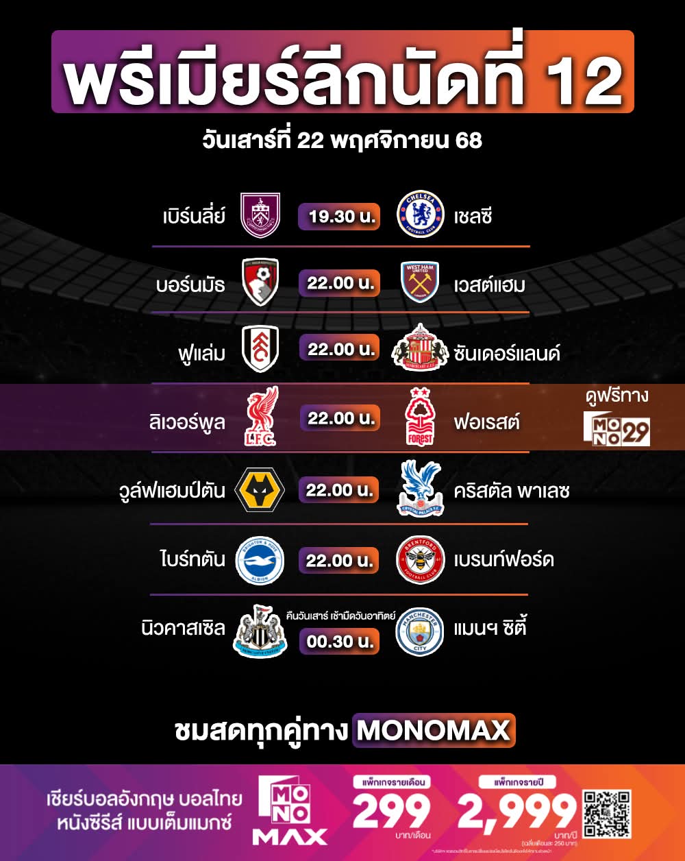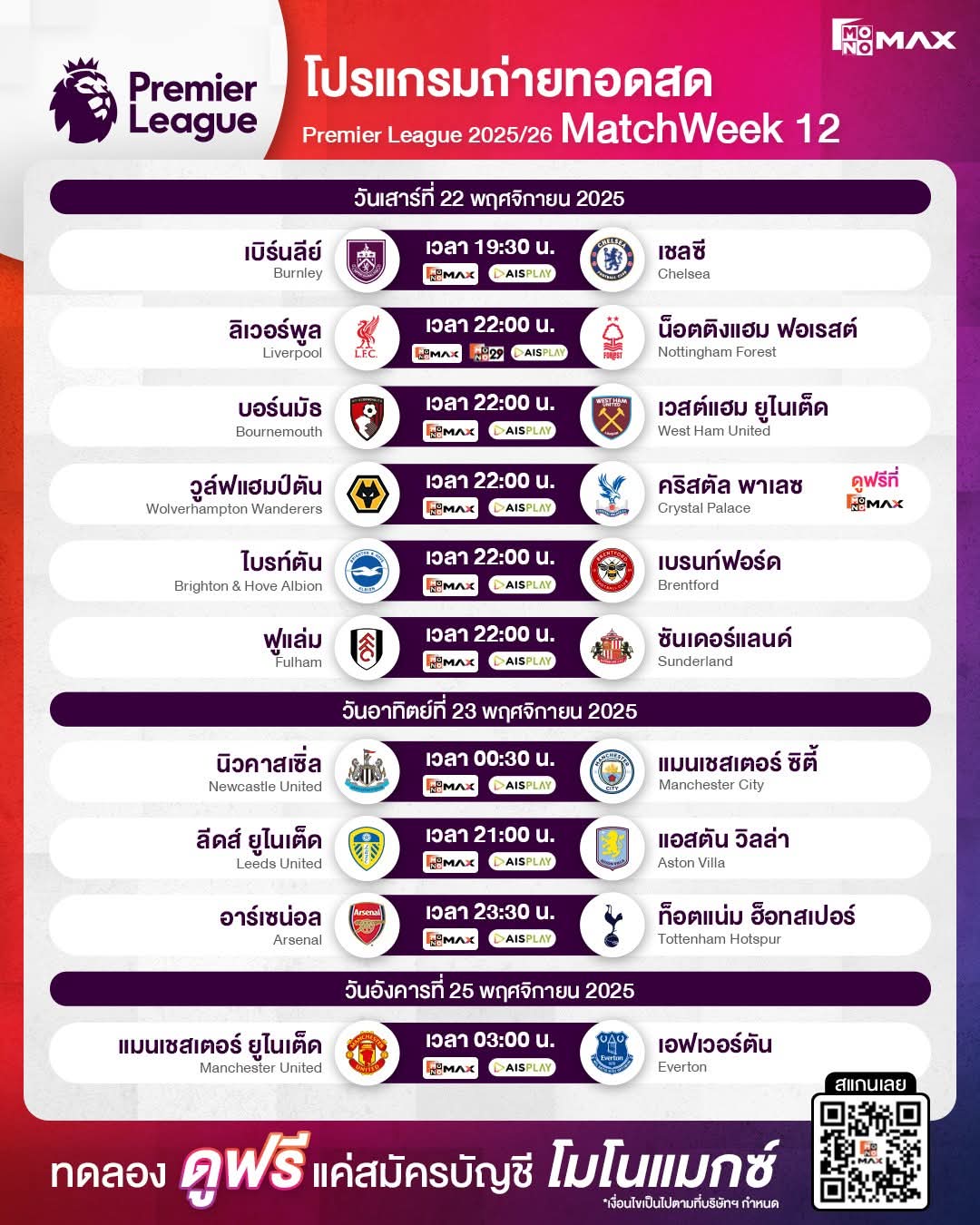 🔎 โปรแกรมถ่ายทอดสด พรีเมียร์ ลีก 2025/26 แมตช์ที่ 12 📺 #Mono29 #Monomax 🔴