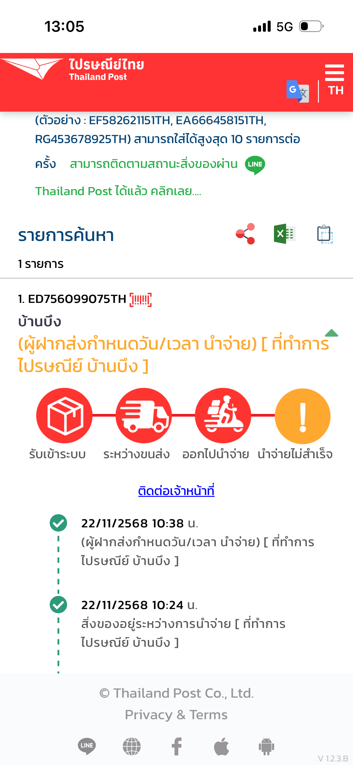 ไปรษณีย์ไทย EMS ขึ้นว่านำจ่ายสำเร็จ [ ที่ทำการไปรษณีย์ นนทบุรี ] แต่ไม่มีของมาส่ง