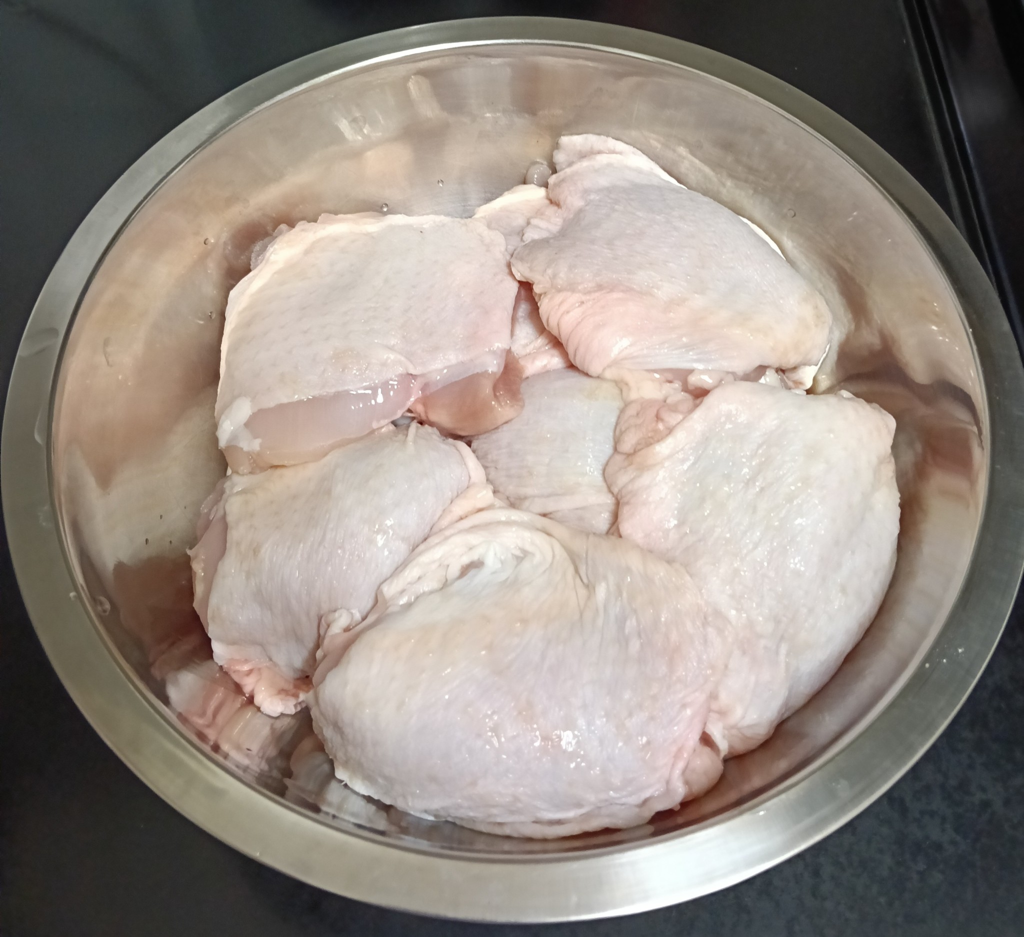 ล้างสะโพกไก่ให้สะอาด พักไว้ให้สะเด็ดน้ำหรือซับให้แห้ง