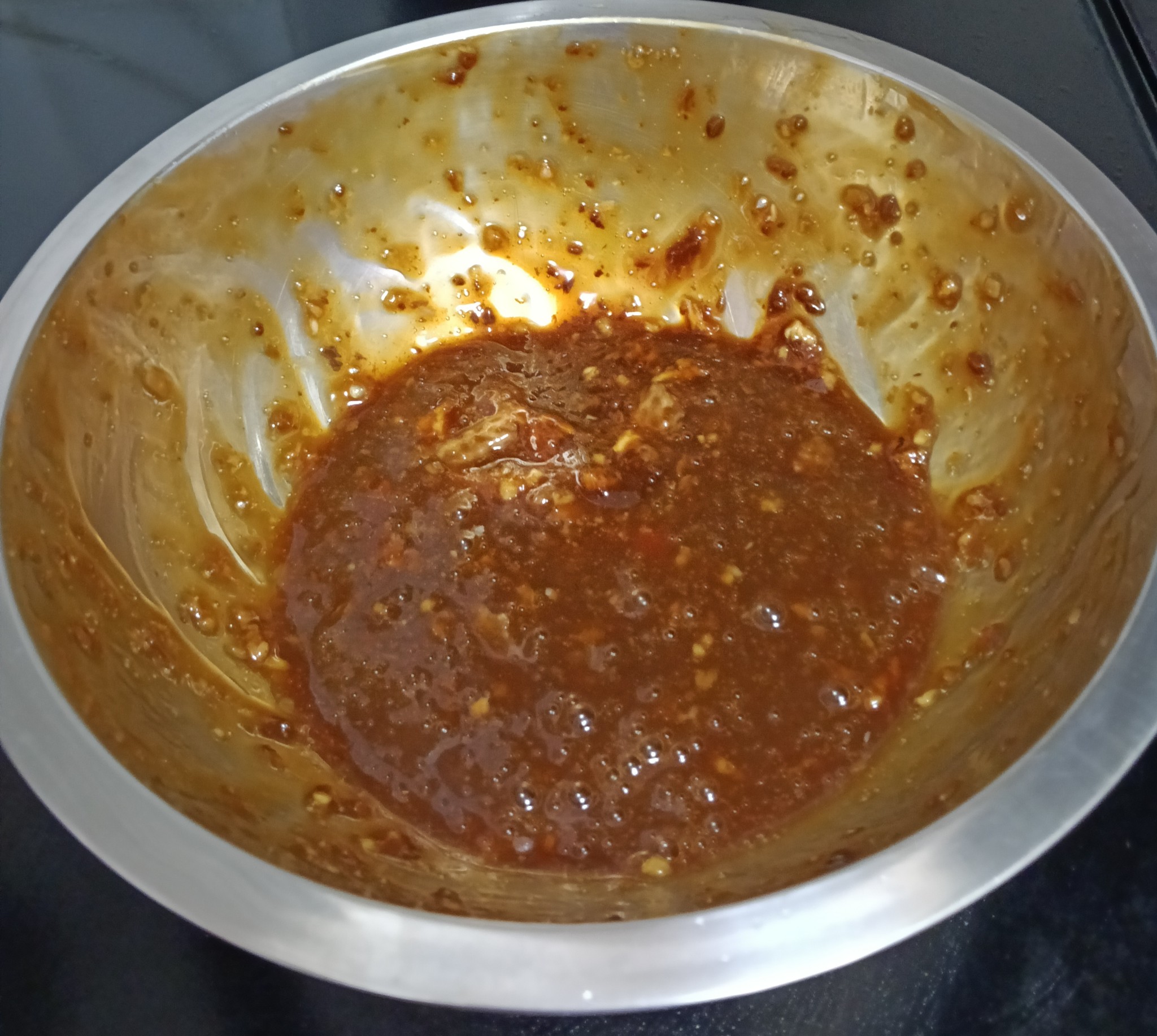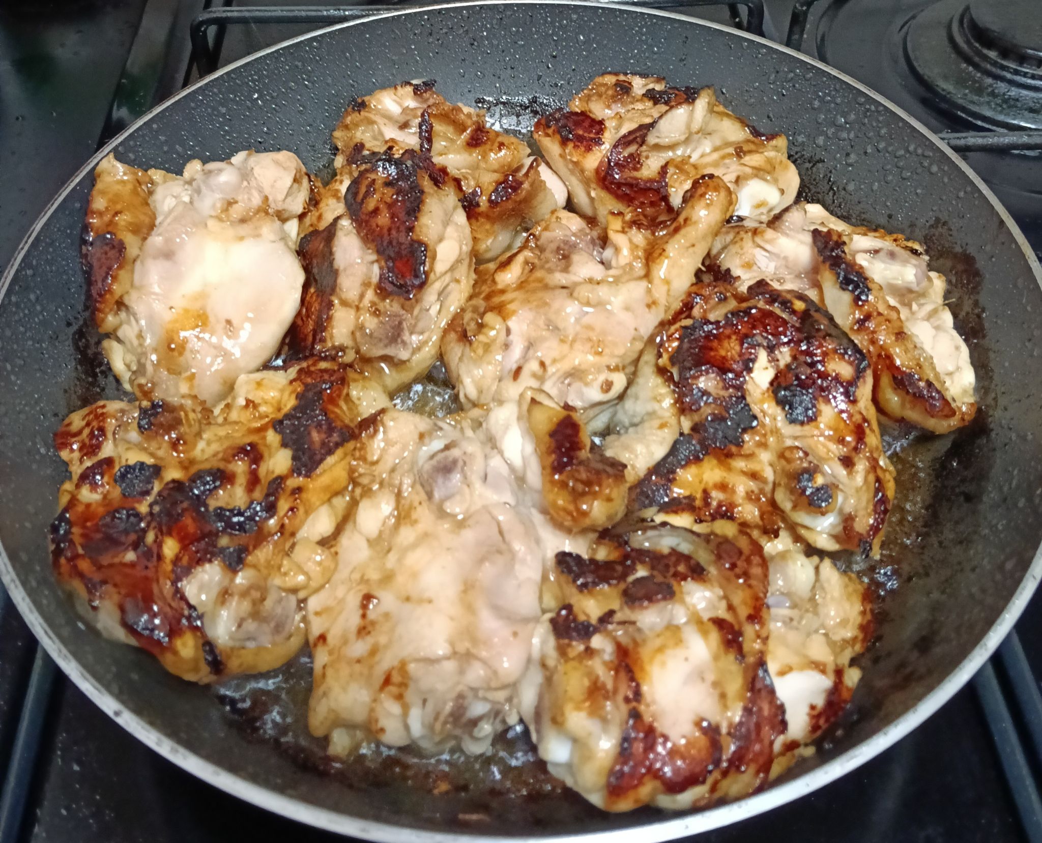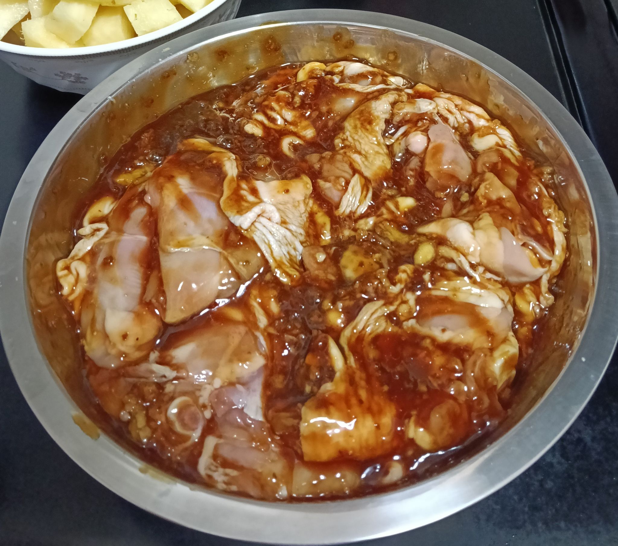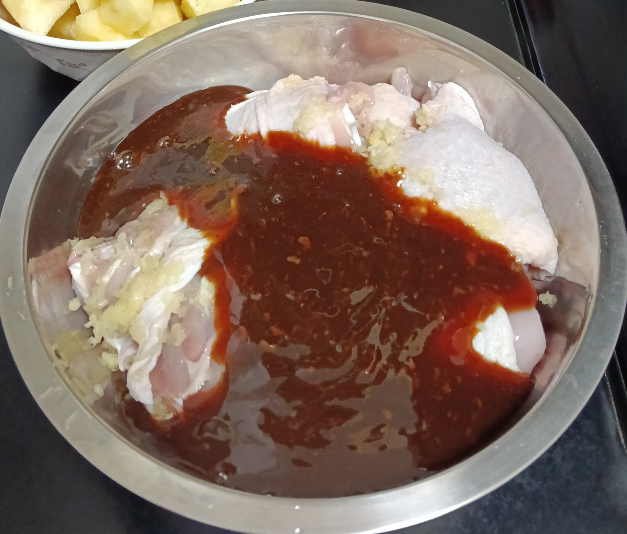 เมื่อไก่แห้งสะเด็ดน้ำแล้ว ก็ทำการหมักไก่ด้วยกระเทียม น้ำผึ้ง ซอสพริก ซอสมะเขือเทศ ซอสหอยนางรม และซีอี๊วขาว