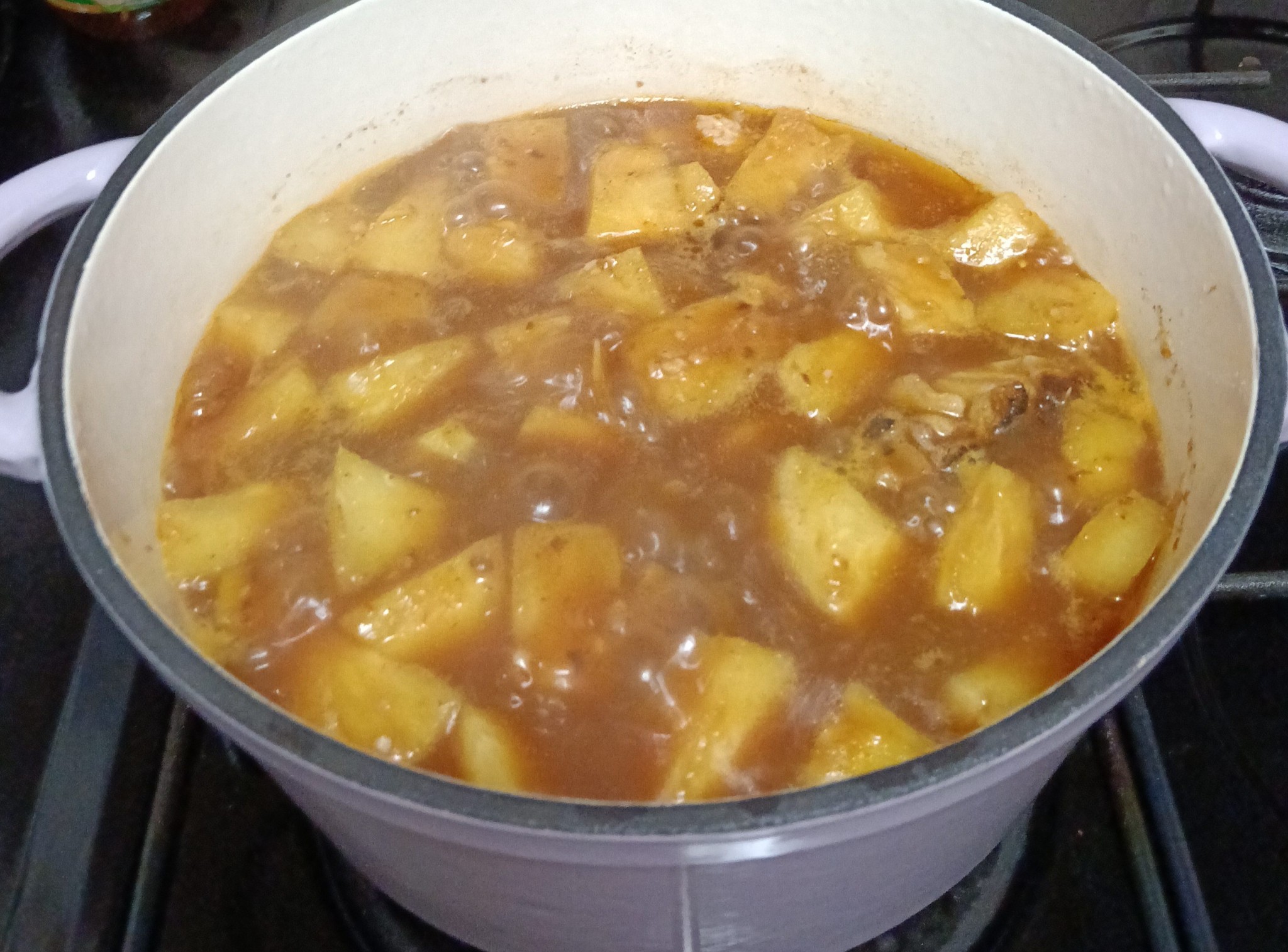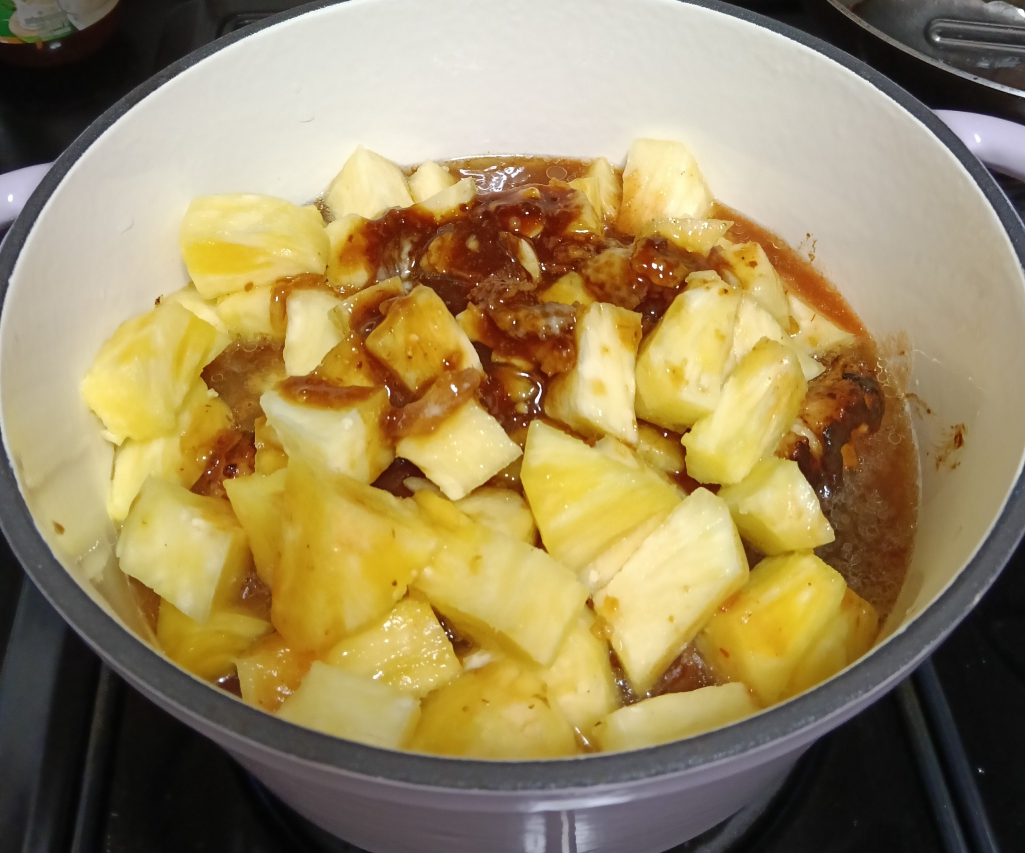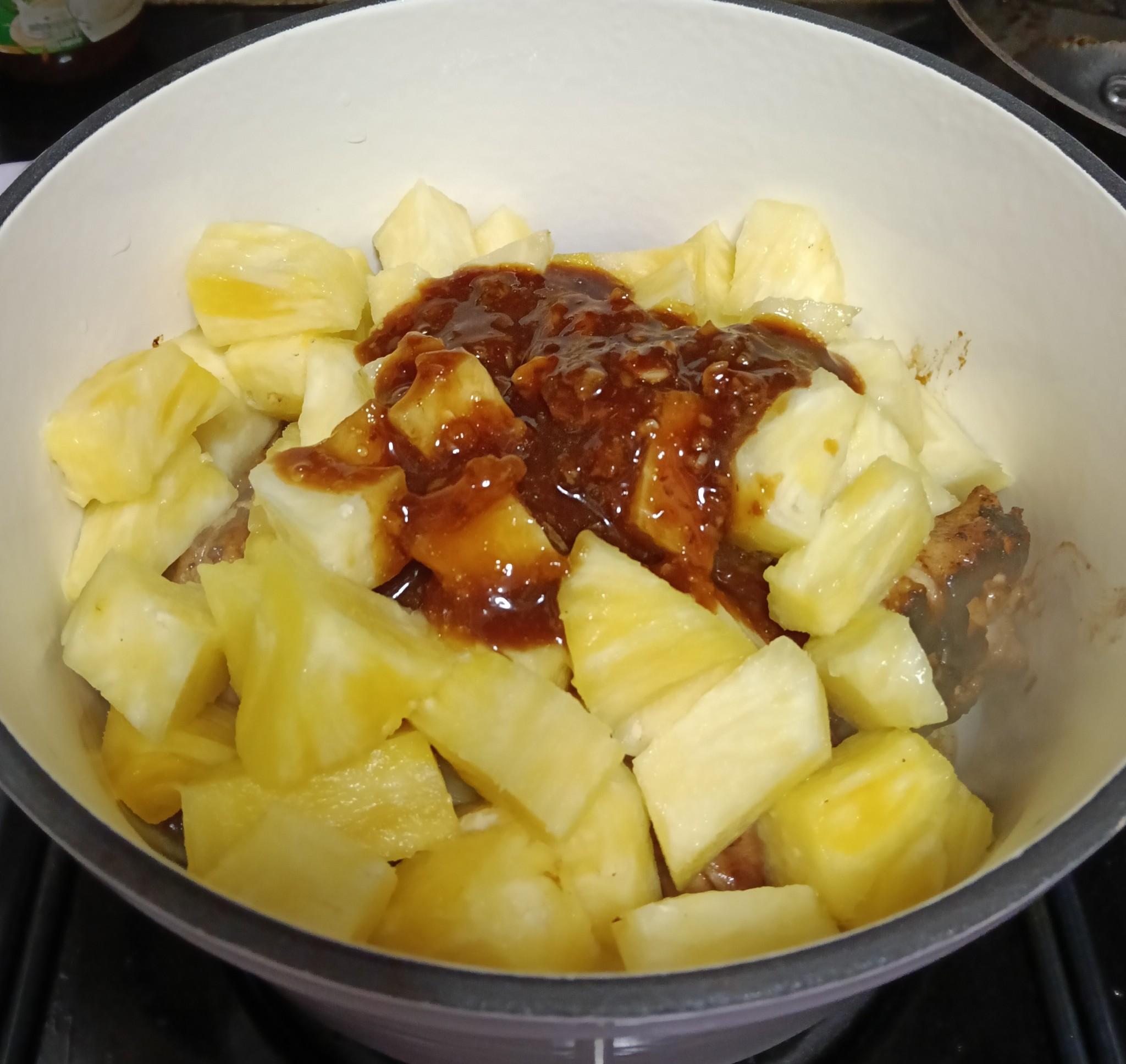 ใส่สับปะรด และซอสที่เหลือจากการหมักไก่ลงไป ตามด้วยน้ำสะอาด