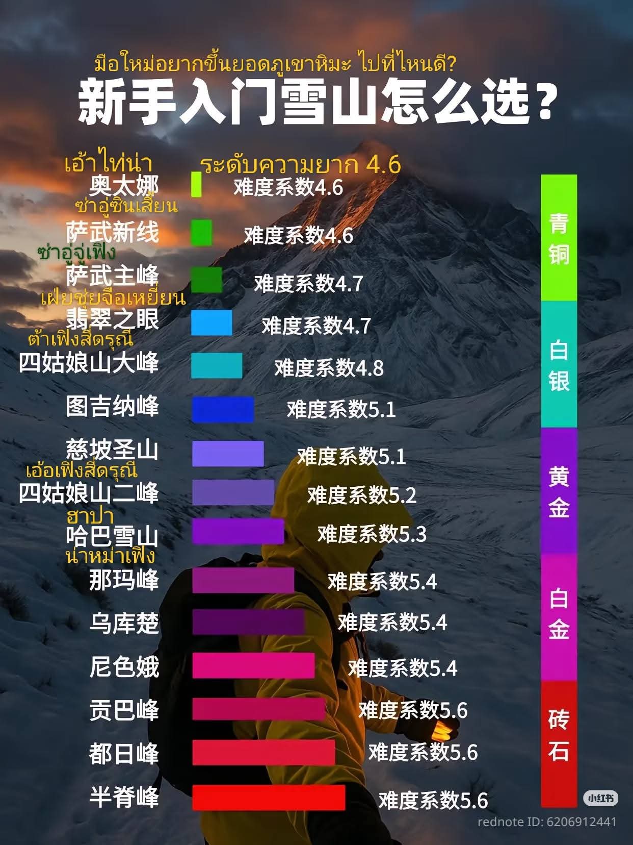 ภาพนี้บอกถึงระดับความยากของภูเขาหิมะสำหรับมือใหม่ เอ้าไท่น่าถูกจัดอันดับไว้ที่แรก ก็คือง่ายที่สุด (เอินเมี่ยวเฟิงไม่อยู่ในภาพเพราะน่าจะใหม่เกืนไป)