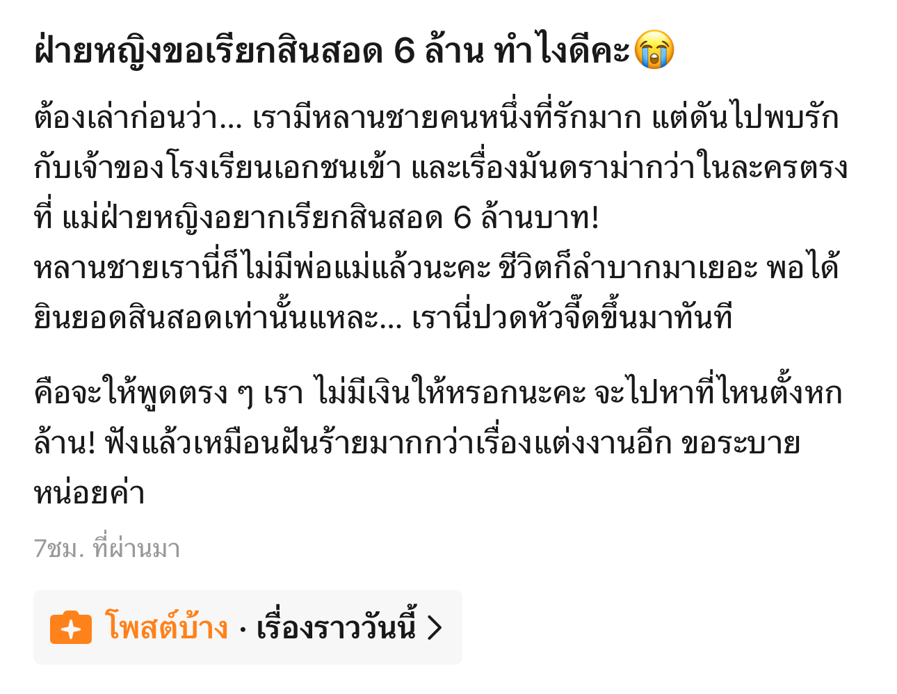 ฝ่ายหญิงขอเรียกสินสอด 6 ล้าน ทำไงดีคะ