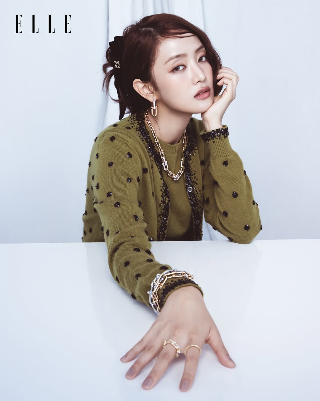 สวมใส่เสื้อผ้าจากแบรนด์ Miu Miu และเครื่องประดับจากแบรนด์ Tiffany & Co.