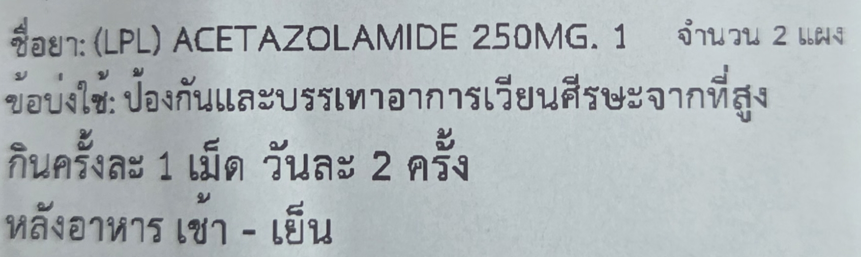 เราเริ่มกินตั้งแต่วันที่ 19 ตุลาก่อนขึ้นเครื่องจากไทย เภสัชบอกให้กินเช้าเย็น กินแล้วเรามีอาการมึนหัวเล็กน้อย ไม่รู้ว่าเป็นจากยาหรือว่านอนน้อย เพื่อนก็รู้สึกเหมือนกัน เลยกินน้อยลง เหลือแค่วันละเม็ด ใน 4 คน มี2คนที่ทานยาทุกวัน ก็ไม่มีอาการแพ้ความสูง หรือเหนื่อยมาก ก็เหนื่อยแบบปกติ ใช้ออกซิเจน 1-2 กระป๋องตลอดทริป ส่วนอีกคนทานไปเม็ดเดียวมึนหัวเลยไม่ได้ทานต่อก็ปกติดี อีก 1 คน ไม่ได้ทานเลย ประกอบกับร่างกายอาจจะไม่ค่อยได้ออกกำลังกาย จึงเหนื่อยมากกว่าคนอื่นใช้ออกซิเจนมากกว่าคนอื่นๆ ตอนเที่ยวอาจจะรู้สึกไม่ดี ไม่ค่อยไหว อาจจะต้องแยกออกไปพักผ่อนก่อนคนอื่นๆ เพราะฉะนั้นใครที่จะไปควรเตรียมร่างกายและจิตใจให้พร้อม ออกกำลังกายเยอะๆ