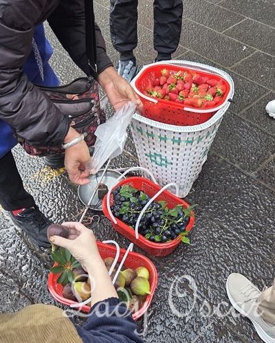 ระหว่างทางเจอคุณป้า หิ้วตะกร้าผลไม้มาขาย มีสตอเบอรี่ องุ่น ลูกฟิก(มะเดื่อฝรั่ง)