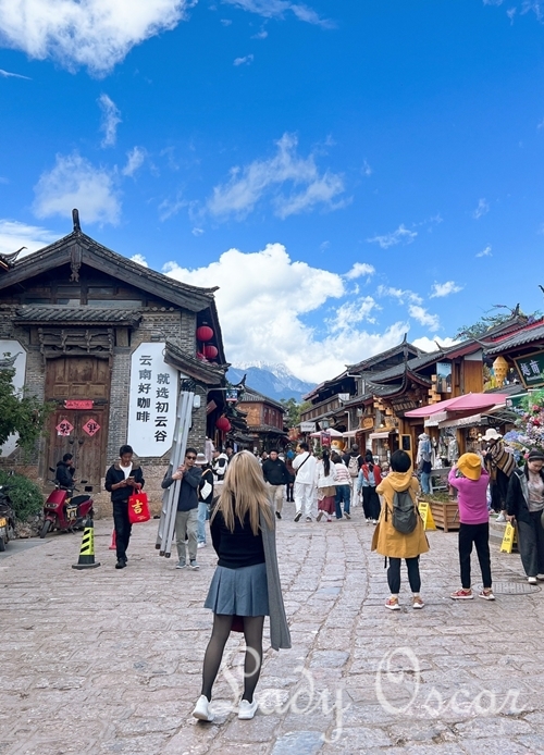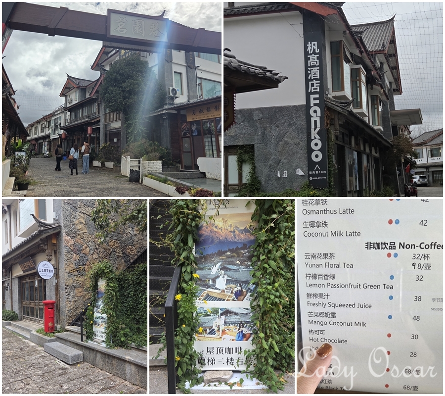 แต่ซอยนี้ถ้าเดินจนสุดซอยออกไป จะเป็นคาเฟ่ที่ชิคน่าดู ถ้าฟ้าเปิดจะเห็นวิวภูเขาหิมะมังกรหยกด้วย แต่วันนี้เมฆมาก ก็เลยไม่ได้เข้าไปถ่ายรูปกัน หิวข้าวแวะกินข้าวตรงนี้กันก่อน เสร็จแล้วเดินกลับมาออกแล้วเลี้ยวขวาไปอีก