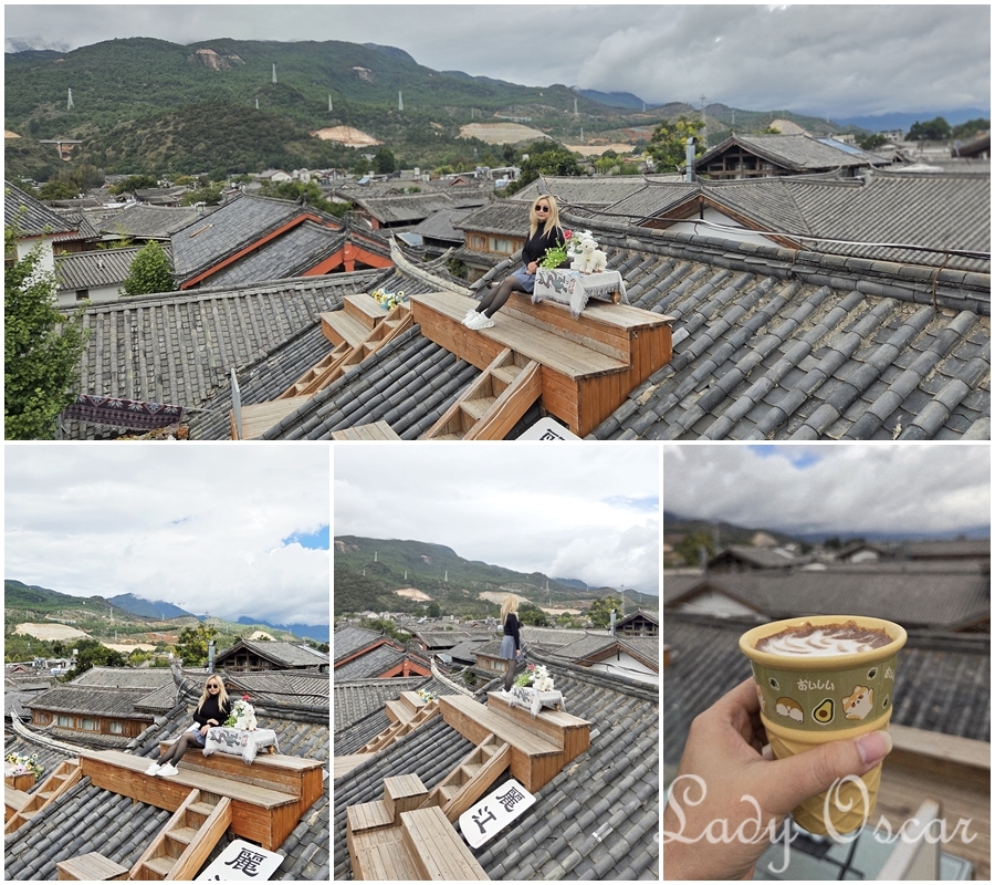 แถวนี้มีคาเฟ่ที่เห็นภูเขาหิมะมังกรหยกหลายที่เลย ส่วนใหญ่ต้องสั่งเครื่องดื่มก่อนจึงจะเข้าไปถ่ายรูปได้