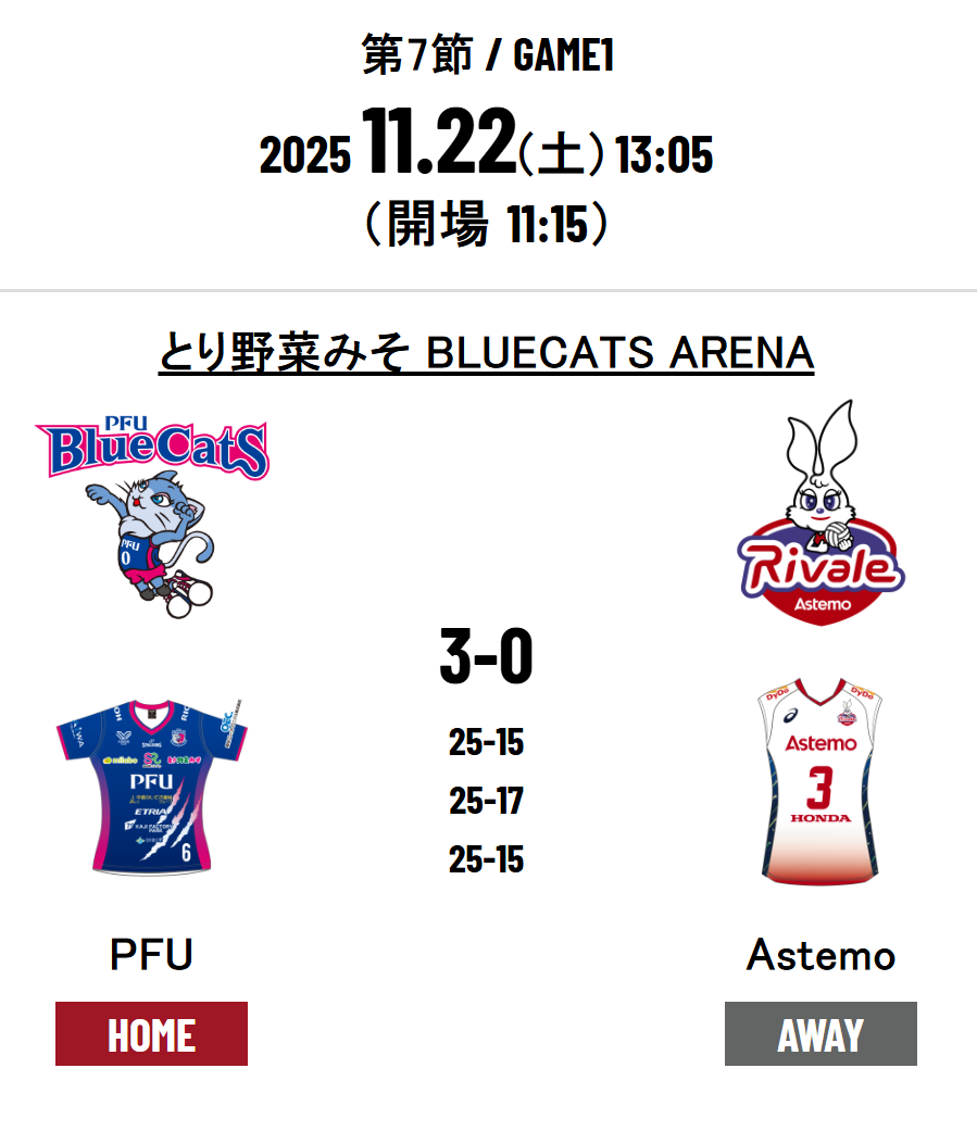 PFU Bluecats Ishikawa Kahoku 3 - 0 ASTEMO Rivale Obaraki