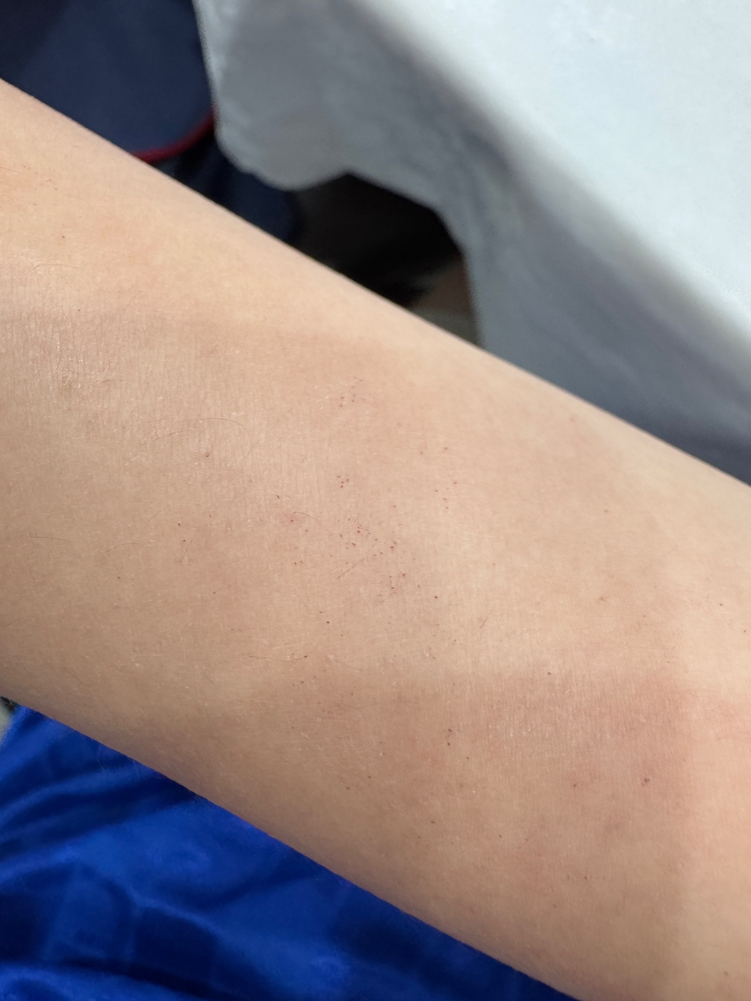 ตามหัวข้อครับ มีจุดแดงๆขี้นที่แขนซ้าย ไม่นูน ไม่คัน ไม่รู้สึกอะไรเลย และมีจุดแดงเล็กๆติดกันหลายจุดเลยครับ เป็นมา3 วันแล้ว เกิดจากอะไรได้บ้างครับ และมีวิธีรักษายังไงบ้างครับ ตามภาพ