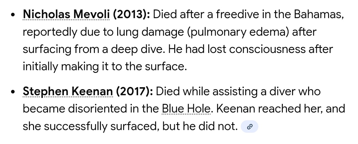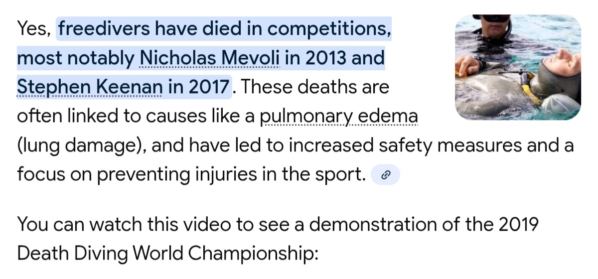ส่วนเหตุกาณ์หนึ่ง... เกิดขึ้นจริง หรือ เป็นเรื่องสมมติ ที่นักเรียนฝึกซ้อมกับครูฟรีไดว์ที่สระลึก 5 เมตร แล้ว Backout แต่โชคดีที่ครูอีกท่านหนึ่งเห็นจึง เข้มาช่วยได้ทัน.... และมี Freedive Instuctor ชาวต่างชาติ อยู่ในเหตุการณ์ ได้เขียนบทความ แสดงความคืดเห็นเผนแพี่ เรื่อง ความปลอดภัย หรือ แสดงความคิดเห็นกับ เหตุการณ์ดังกล่าว. แล้วถูกห้ามเข้าพื้นที่นั้นอีก