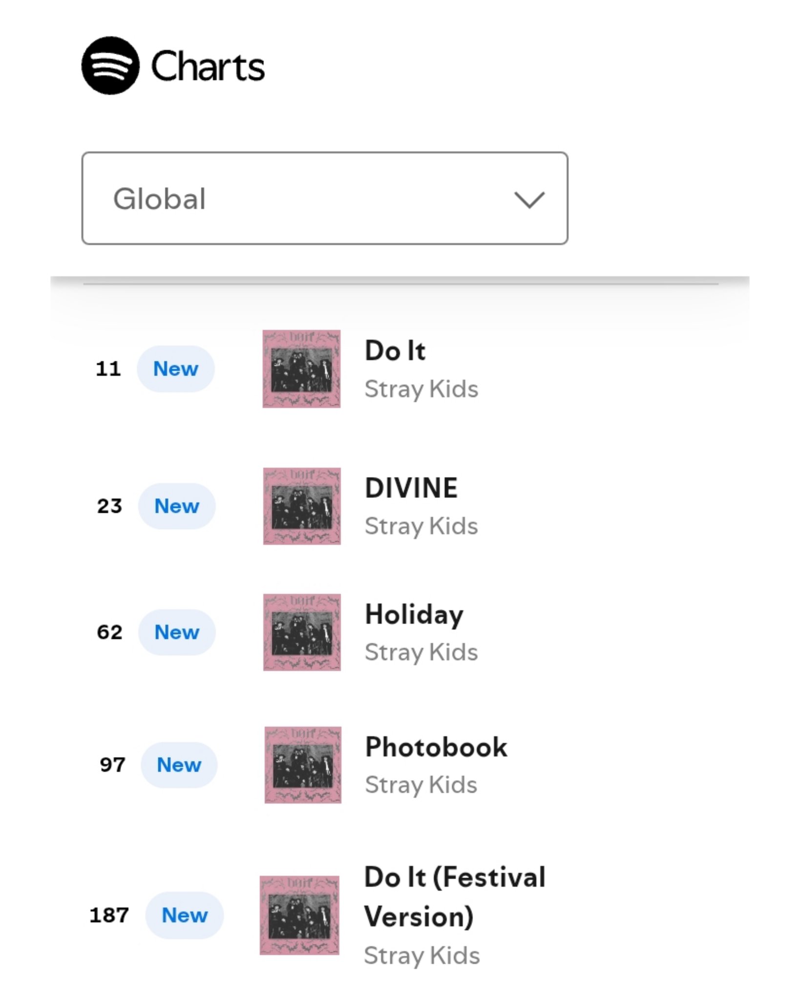 - เป็นวงดนตรี K-pop วงเดียวในปี2025 ที่มีเพลงต้นฉบับทั้งหมดจากหลายอัลบั้มเปิดตัวบน Spotify Global Chart