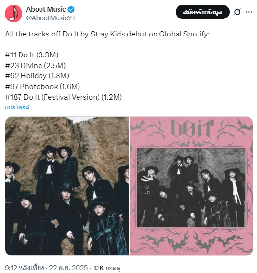 🔥 Stray Kids "DO IT" เปิดตัวที่อันดับ 11 บน Spotify ทั่วโลก โดยมียอดสตรีม 3.336 ล้านครั้ง นอกจากนี้ยังเปิดตัวที่อันดับ 13 บน Spotify ของสหรัฐอเมริกาด้วยยอดสตรีม 756,000 ครั้ง - ทำลายสถิติกา