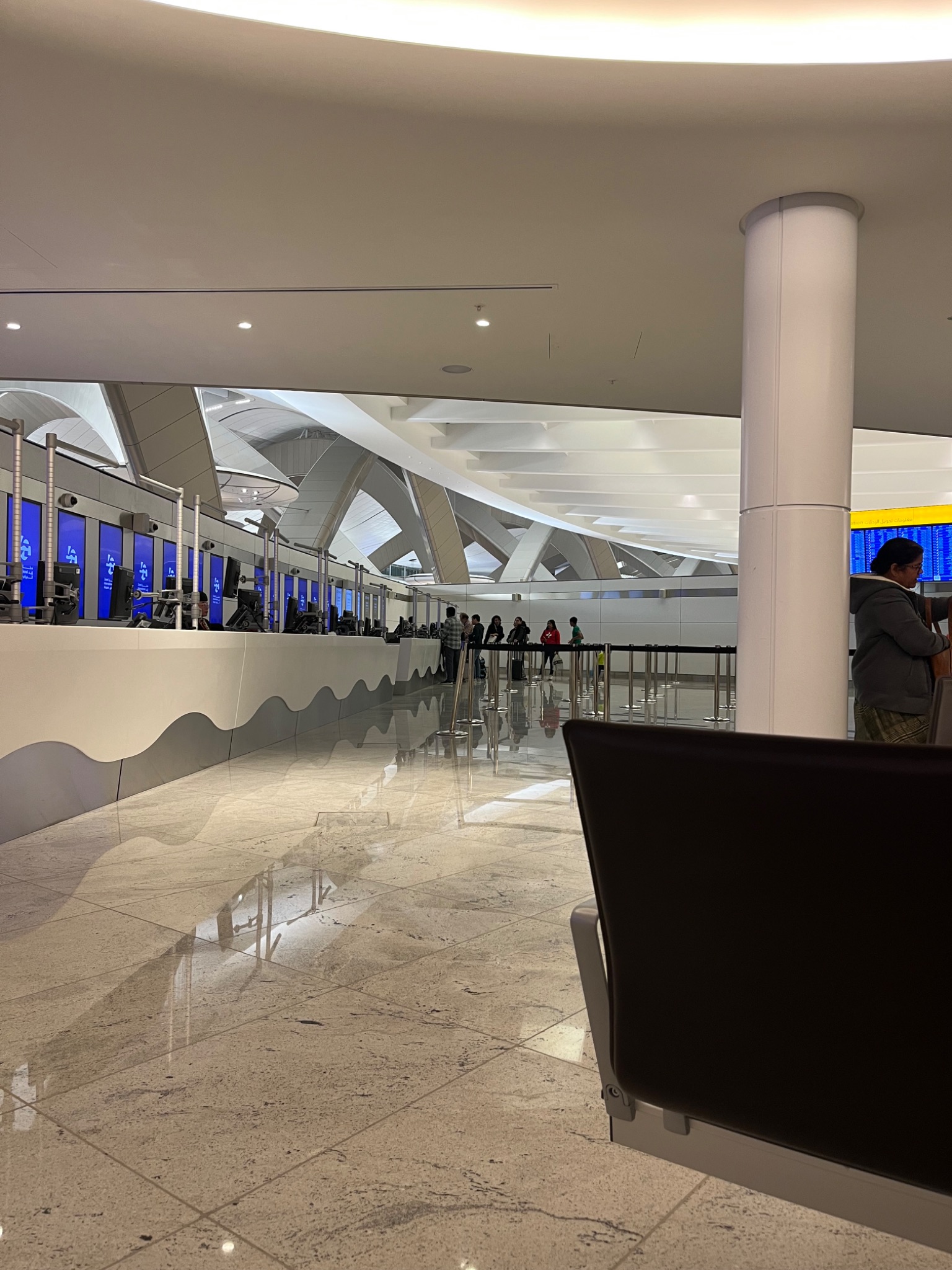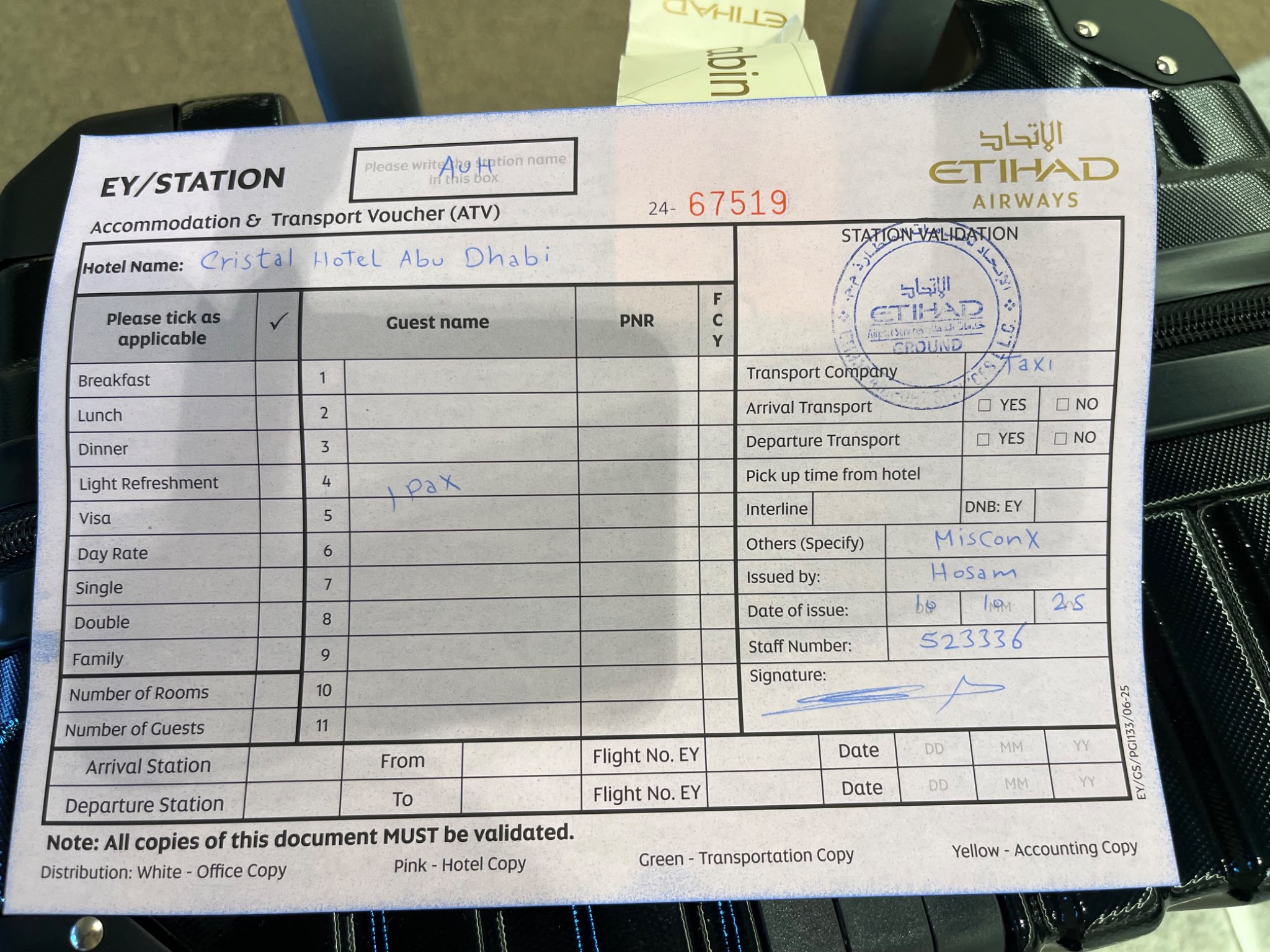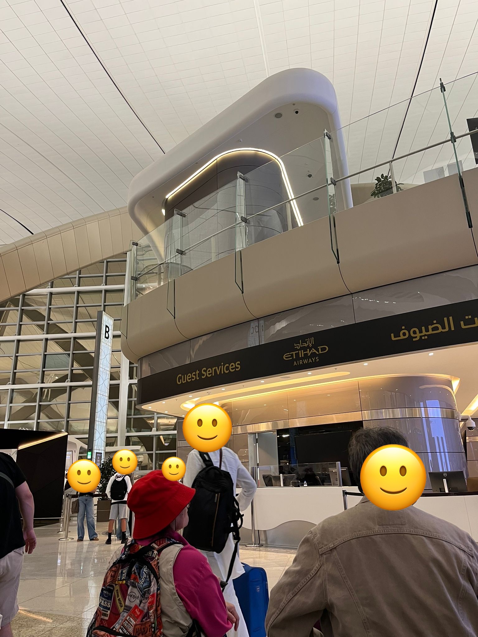 เราต้องเดินไปที่ชั้น 3 ตรงเคาท์เตอร์ ใกล้กับ Row C เพื่อติดต่อเรื่อง Taxi จากสนามบินไปส่งที่โรงแรม Cristal Hotel Abu Dhabi โดยที่ไม่สามารถเอากระเป๋าเดินทางออกไปด้วยได้ ทางสายการบินบอกว่ากระเป๋าเดินทางของคุณจะถูกส่งไปรอที่ไฟล์ทใหม่ในวันพรุ่งนี้