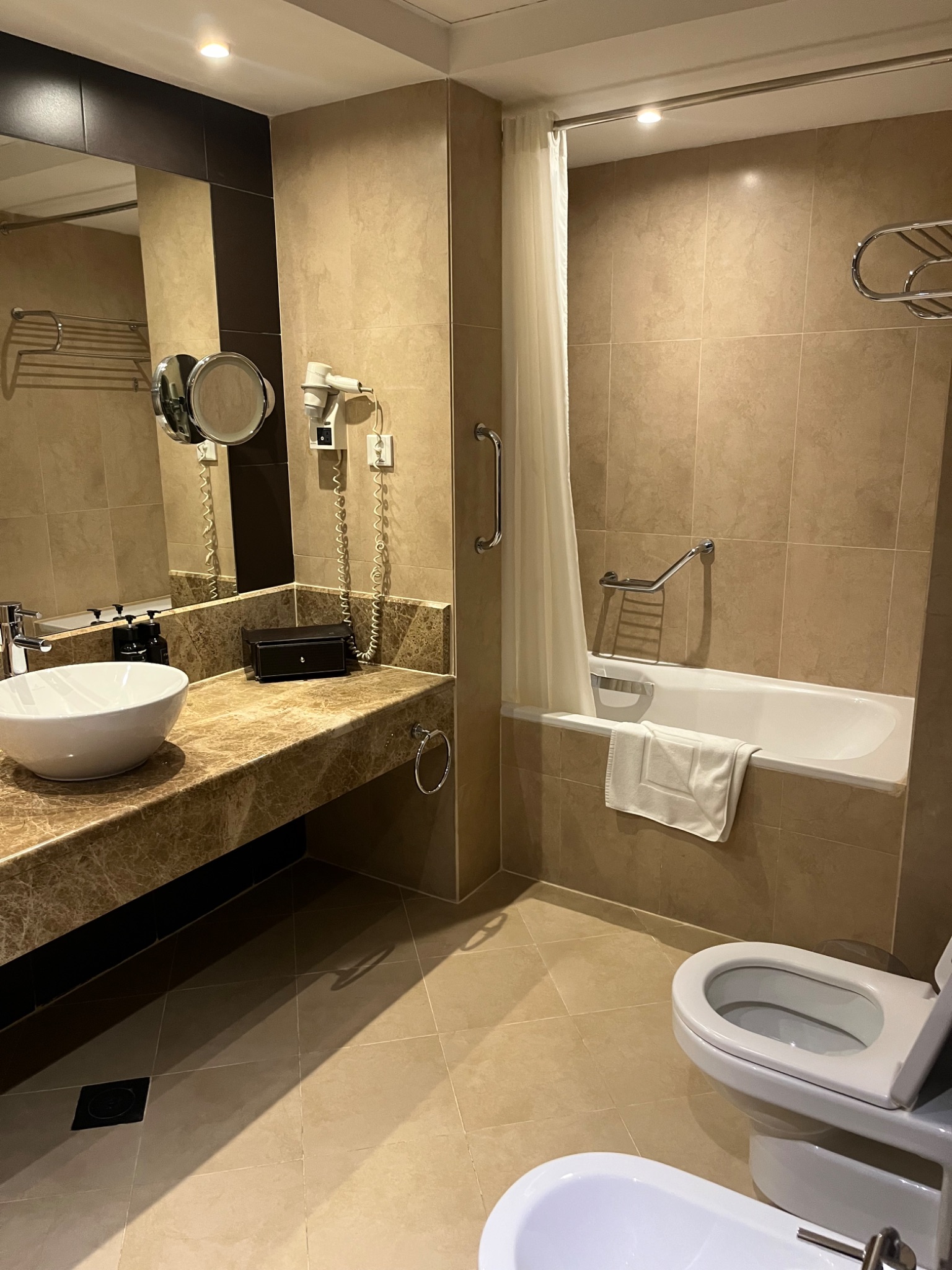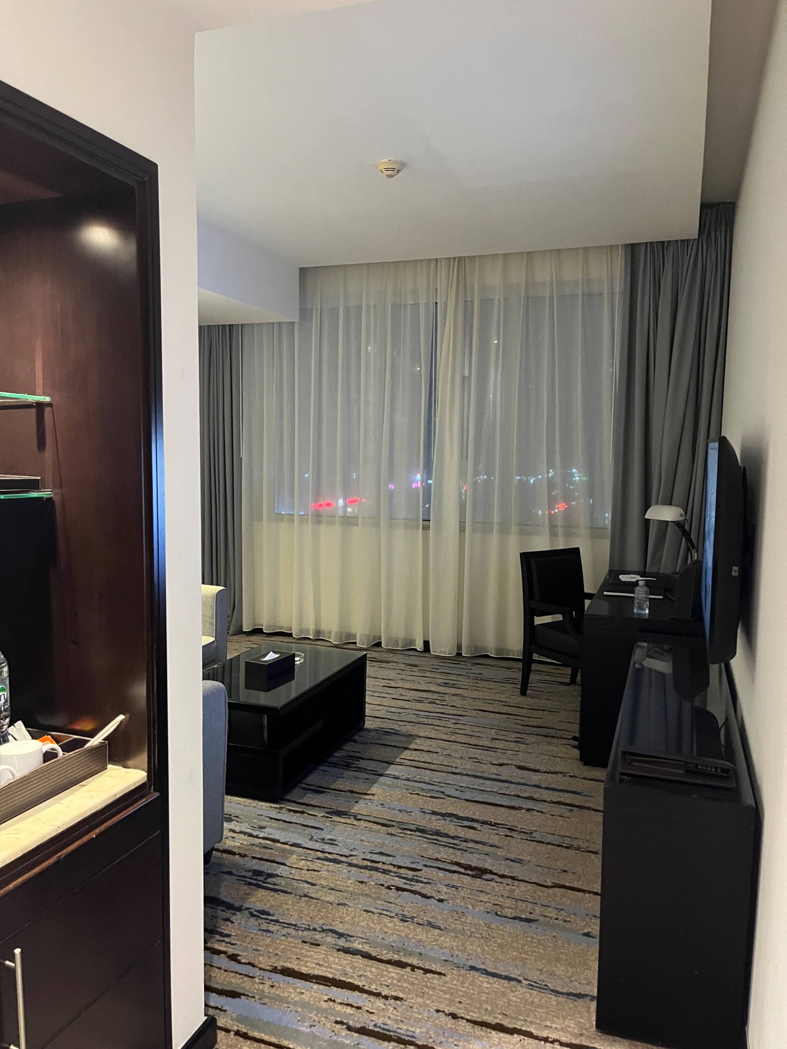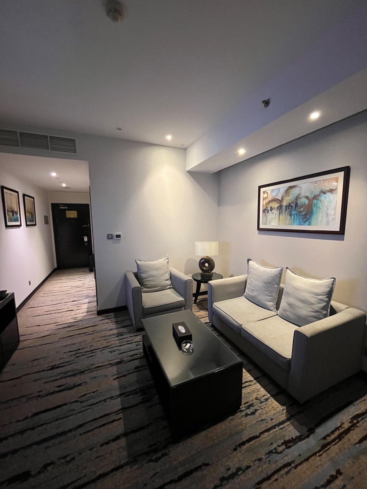 จากสนามบินไปที่โรมแรม Cristal Hotel Abu Dhabi ใช้เวลาประมาณ 45-60 นาที คุณพระช่วย! คนขับซิ่งมาก ใช้ความเร็ว 140-150 km/h หัวใจจะวาย
