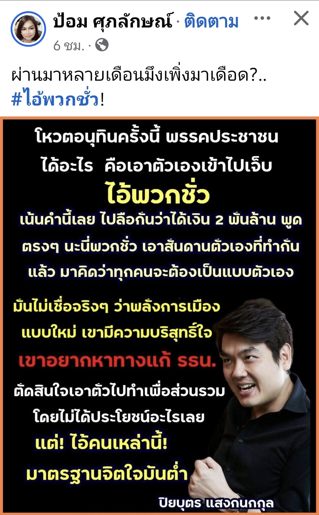 ถึงกับสักแขนชื่อปิยบุตร ธนาธร มาวันนี้เพิ่งจะตาสว่างว่า พรรค event กลวงๆ เสียดายไปนิด clip จะดีกว่านี้ถ้าไม่พูดไปด่าไป กลบเนื้อหาหมด https://www.facebook.com/119957109805387/posts/196619932139104/